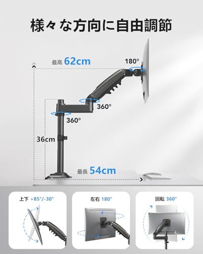 【全方向フリー角度調節】革新的な多軸設計で画面を上35、下85、左右90、回転360と、あらゆる方向にスムーズに調整可能。アーム部も最長54cmに伸ばすことができ、お好みの角度に簡単に調整できるため、どんな姿勢でも画面が見やすく、目の負担を軽減。集中力を持続させ、作業効率を高めます。