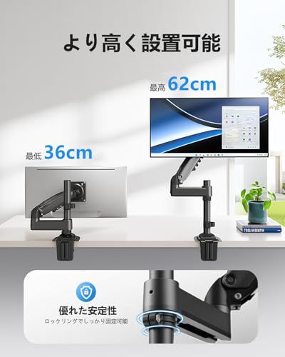 【ガス&ポール式で実現する快適な目線】オフィスでも、在宅ワークでも、理想の高さを追求するあなたへ。HUANUOモニターアームHNSS8はスムーズな角度調節が可能な「ガススプリング」と、高い位置をしっかり支える「ポール(立柱)」を組み合わせる構造を採用しており、従来のモニターアームでは物足りなかったより62cmまでの高い視点を実現します。モニターを思い通り高く設置できることにより、姿勢は自然と正しく、作業効率と快適さが格段にアップ!