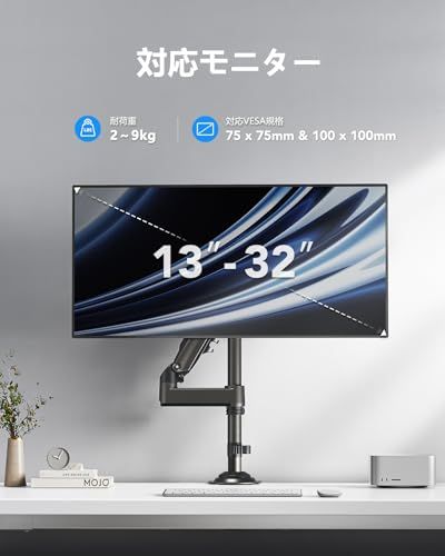 【ご購入前のチェックポイント】?モニターのサイズが1732インチ以内、重量が29kg以内。 ?モニターのVESA(背面のネジ穴の間隔)が75x75mmまたは100x100mm。 ?クランプ式の場合はデスク天板厚さ10mm95mmに対応・グロメット式の場合は天板厚さ10mm95mmに対応。モニターと取り付ける場所が対応範囲内であることを確認してください。