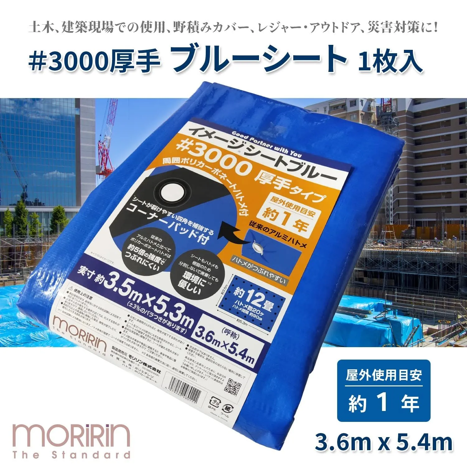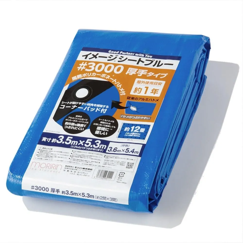 モリリン ブルーシート レジャーシート イメージシートブルー #3000 厚手 3.6×5.4m ポリカーボネートハトメ 使用目安約1年 1枚入