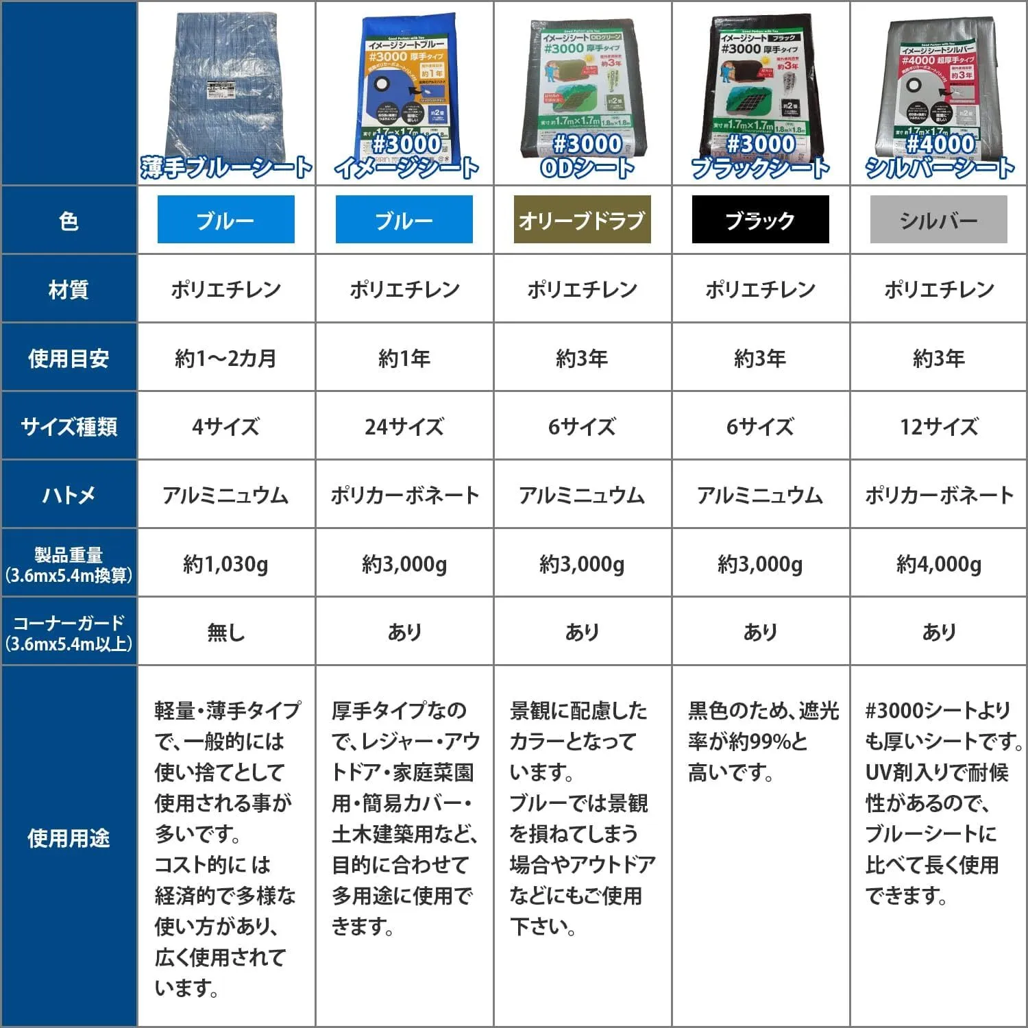 [仕様]#3000厚手、材質:ポリエチレン(本体)、ポリカーボネート(ハトメ)、ハトメ数20ヵ所、ハトメ間隔約90㎝。