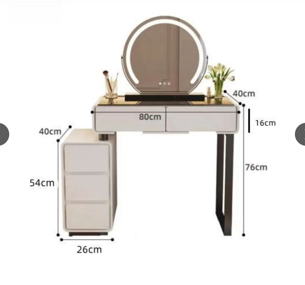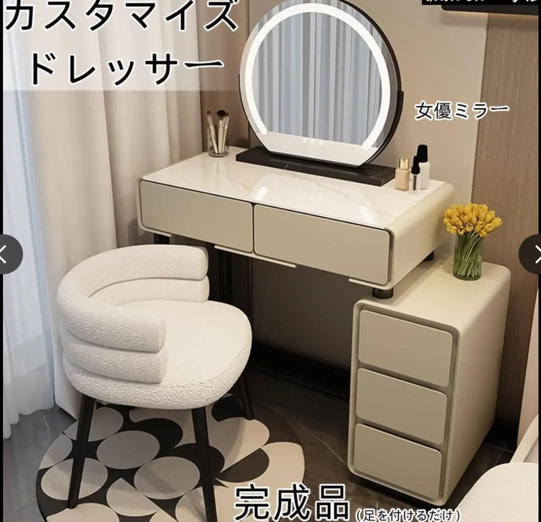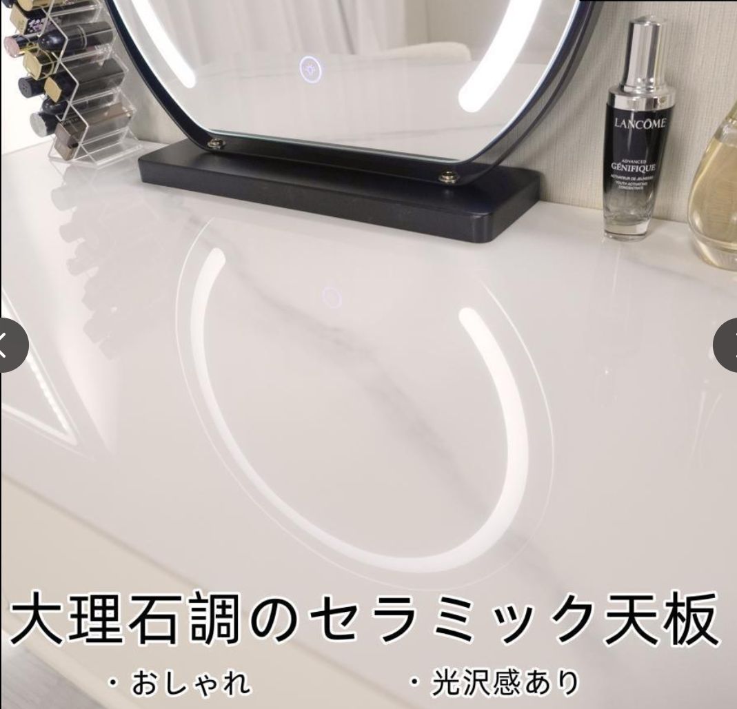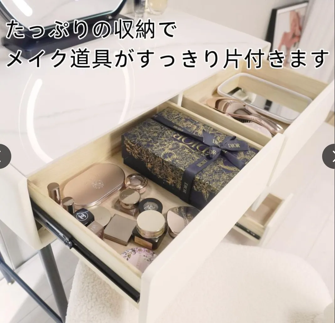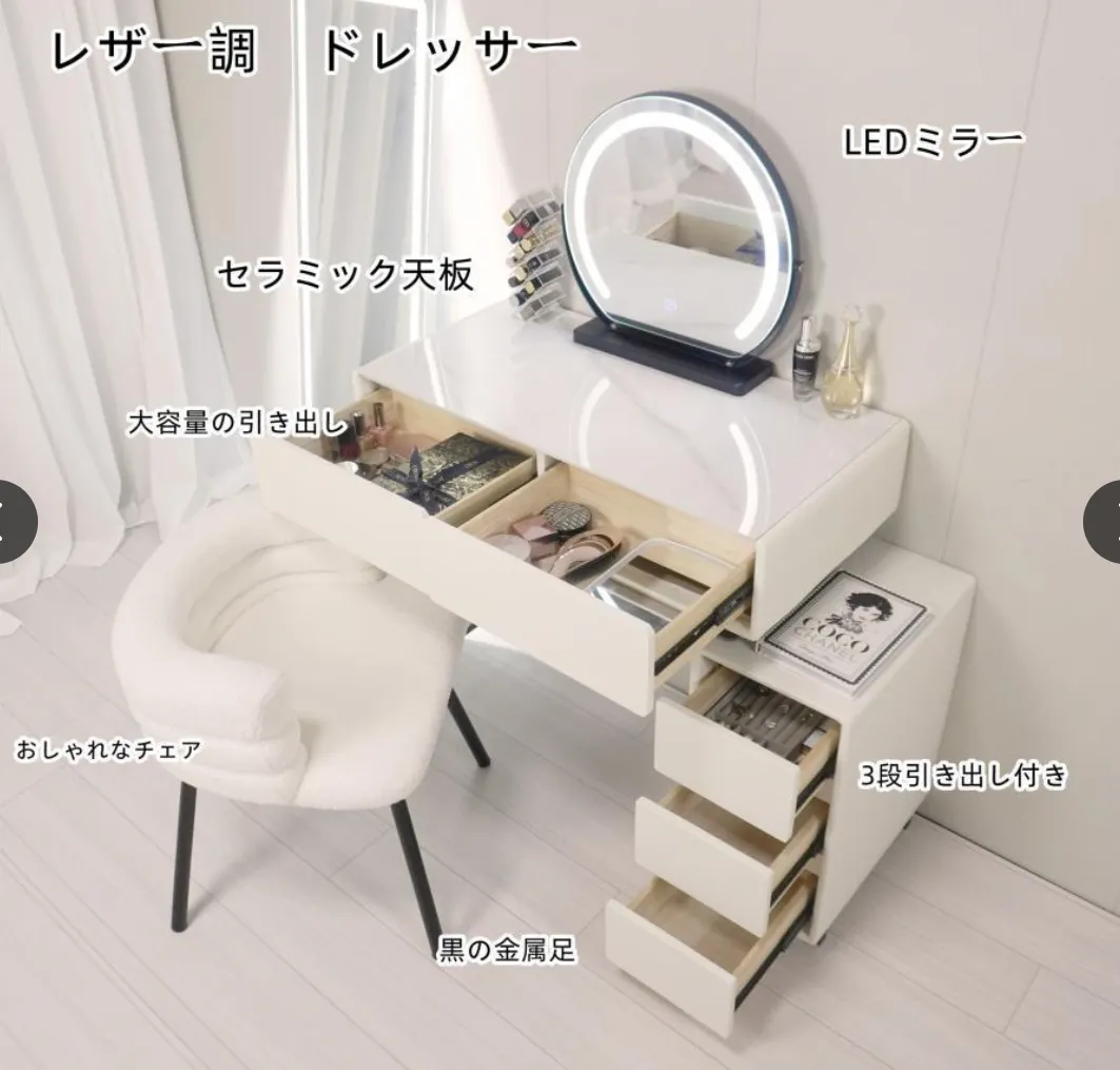 LEDミラーは明るくクリアな照明を提供し、どんな時間帯でも完璧なメイクアップを可能にします。スツールは快適な座り心地を保証し、長時間の使用でも疲れにくい設計です。サイドテーブルが付属しており、追加の収納スペースやディスプレイスペースとしても活用できます。