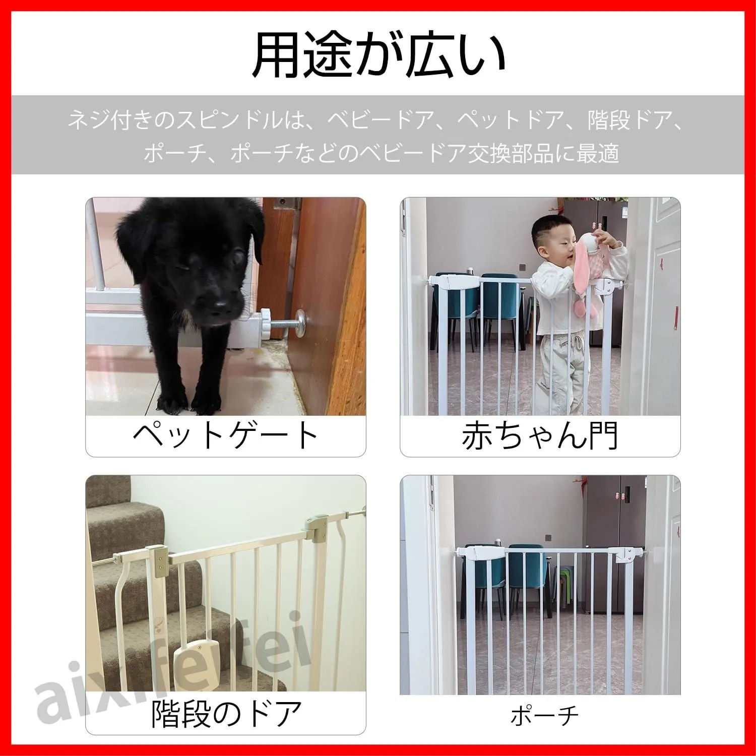 【幅広く使用可能】このベビーゲートねじ付きスピンドルは、ベビードア、犬ドア、階段ドアなどほとんどの取り付け圧力式ドアに適応しています。家族向けの住宅、ペットショップ、ペット病院、幼稚園などさまざまな場所で活用できる設計となっています。安全性と汎用性を高め、多様なニーズに応えることができます。