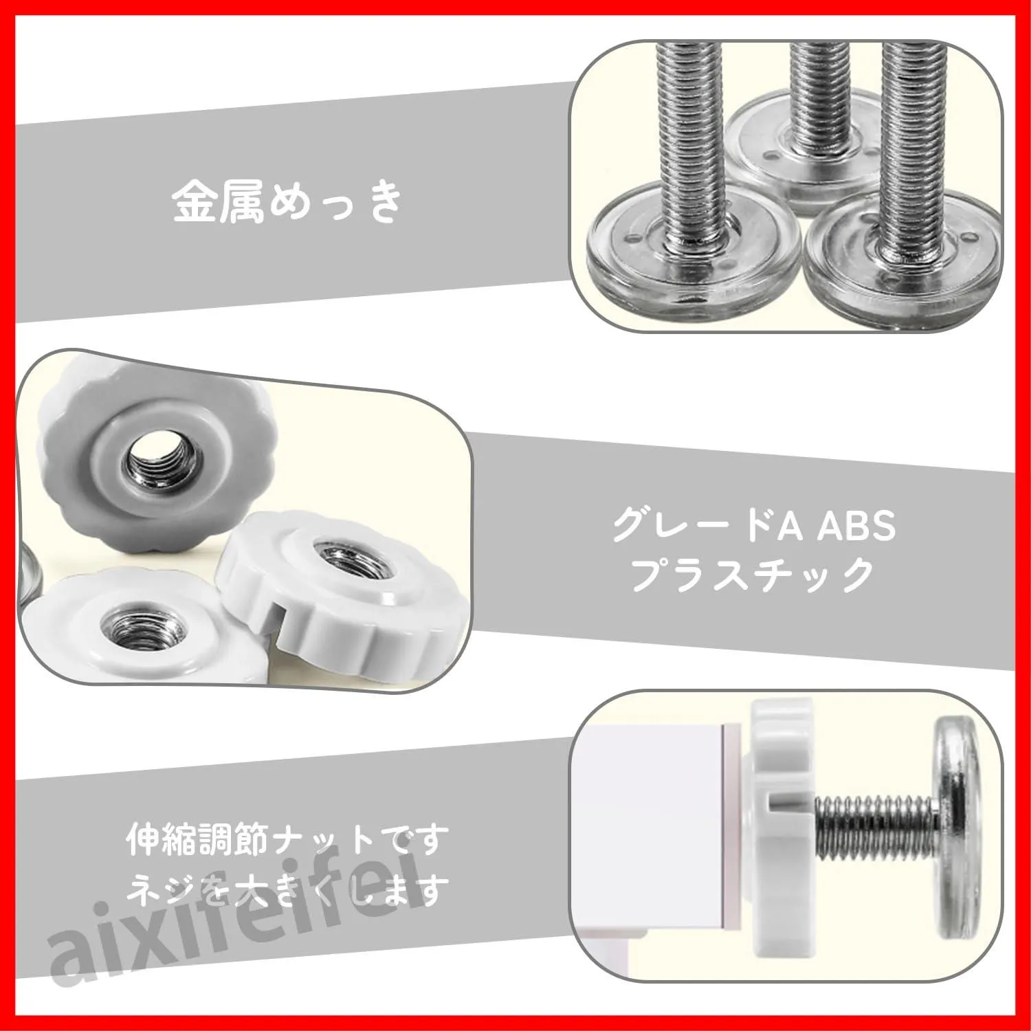 【取り付けが簡単】:工具は不要です。壁に傷をつけることなく、ナットを回すことで壁に対して逆力を発生させることができます。また、調節機能が付いているため、簡単にフィットするよう設計されています。