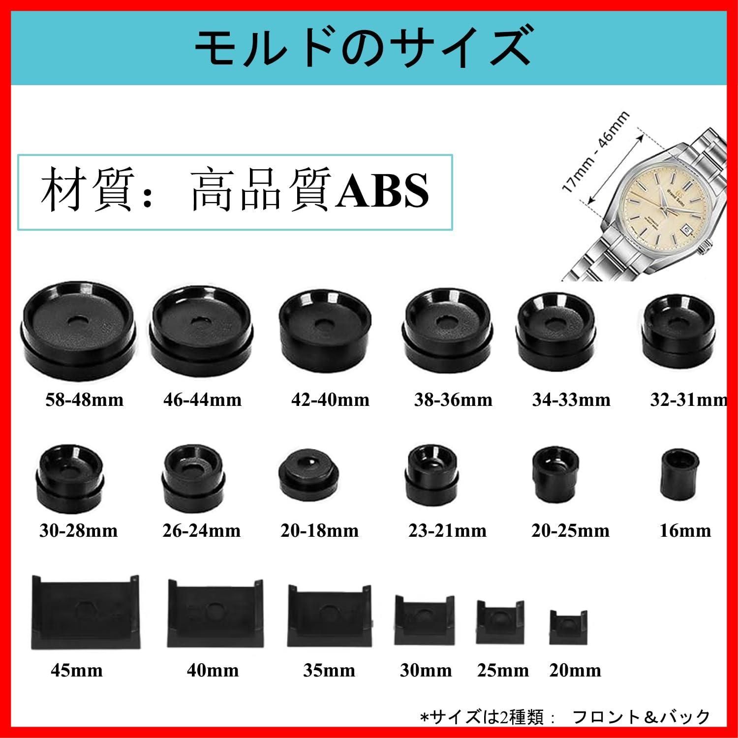 【完全なサイズ】:18種類アダプター金属芯コマ付属、上品で長持ち。ABS樹脂で作られて、取り付け方が簡単、腕時計にも傷つけない。金型規格:50/48 mm、46/44 mm、42/40 mm、38/36 mm、34/33 mm、32/31 mm、30/28 mm、26/24 mm、23/21 mm、20/18 mm、16 mm、25/20(平)、四角45 mm、40 mm、35 mm、30 mm、25 mm、20 mm。時計のサイズに合わせて替えられるコマ18種類付きで、お持ちの様々な時計に対応します。