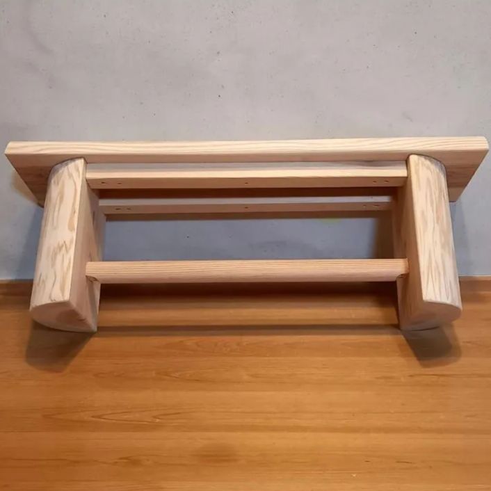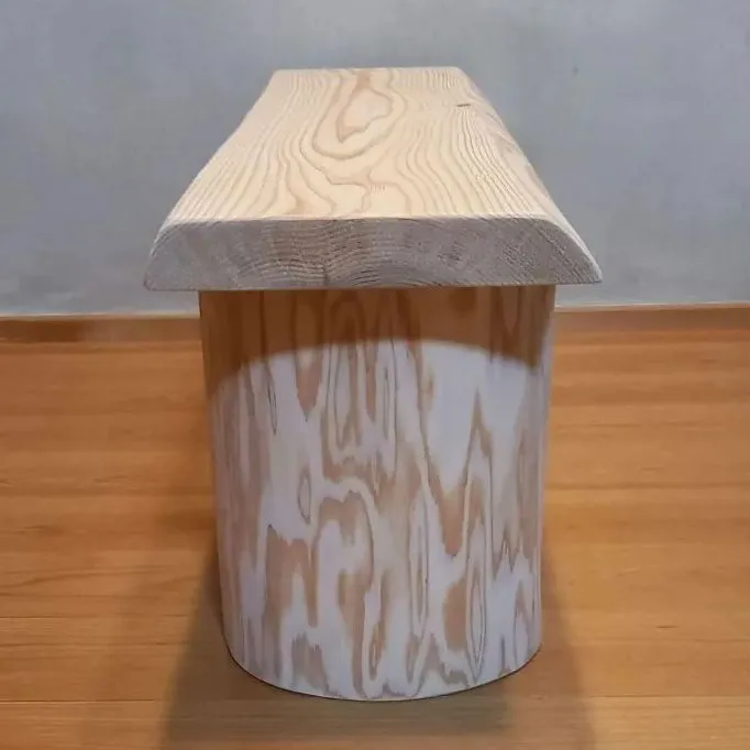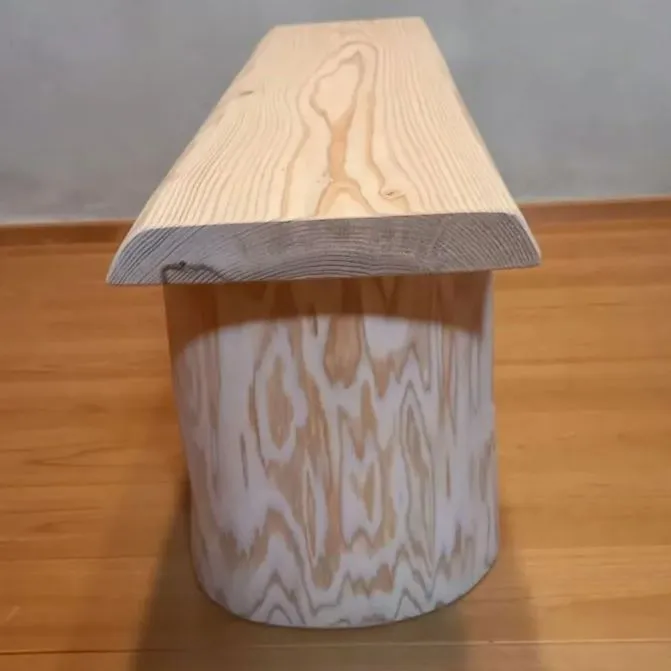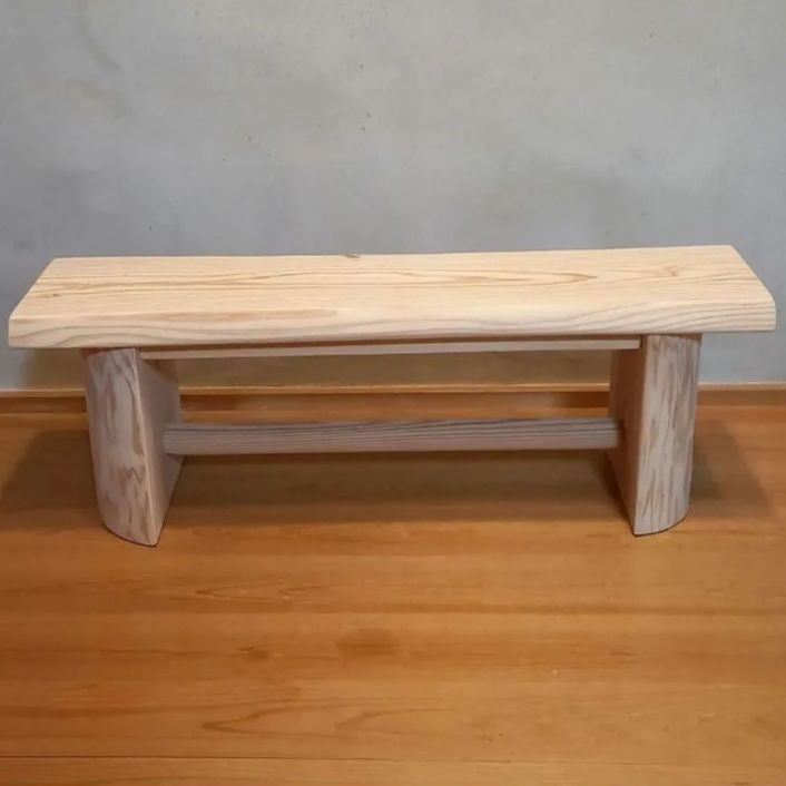シンプルな杉一枚板の2人掛けベンチ。脚には丸太のハーフログを使用したどっしり設計🪵