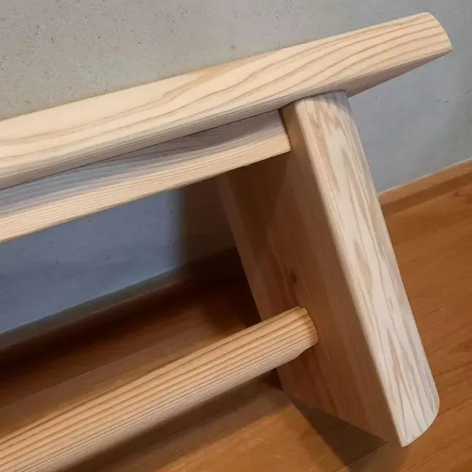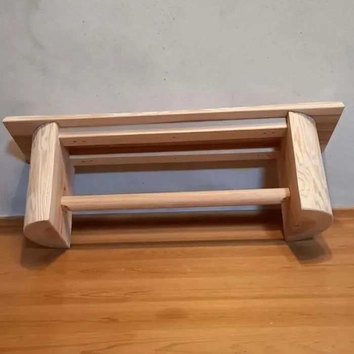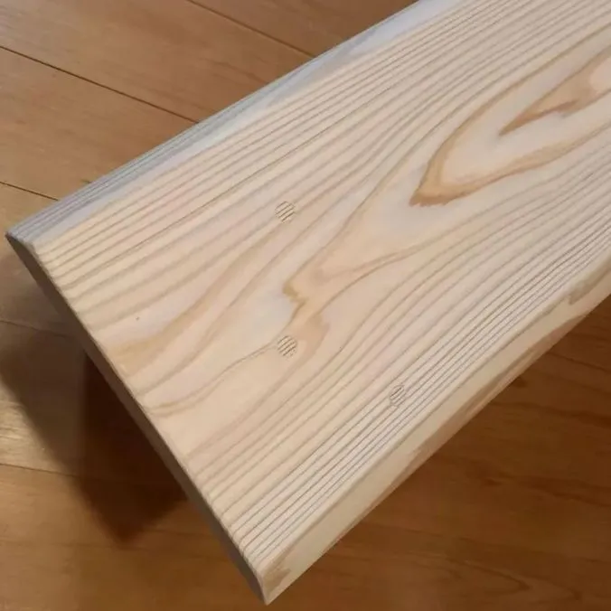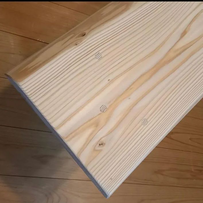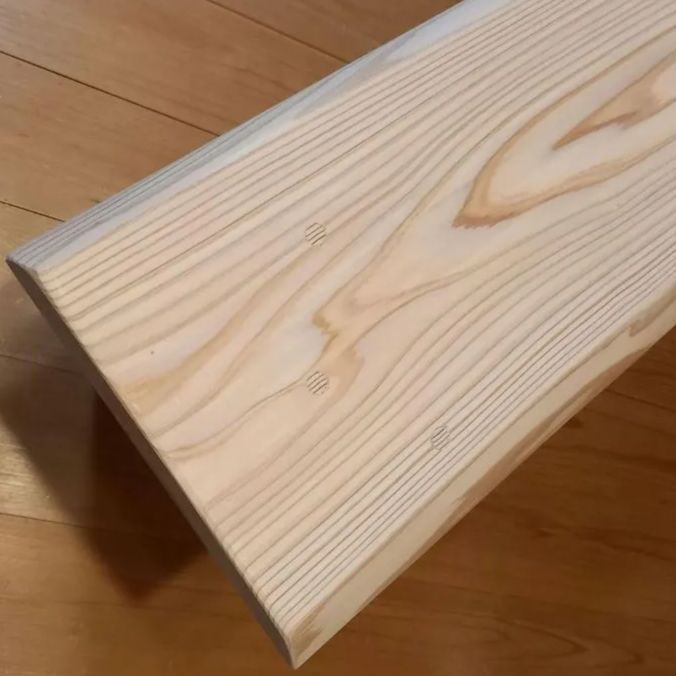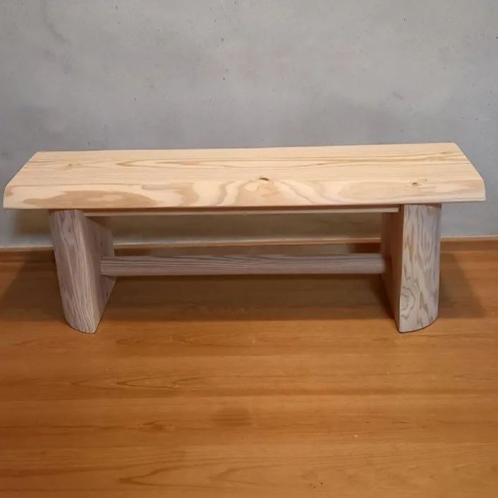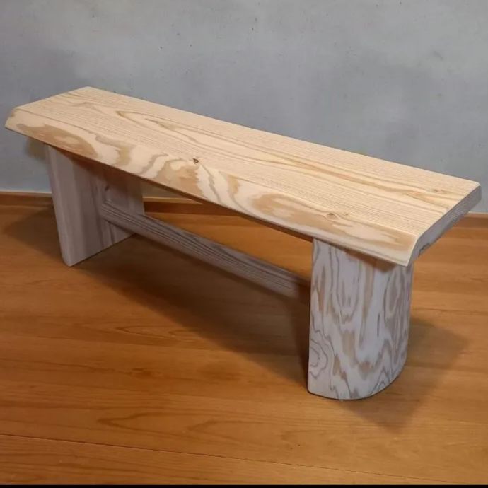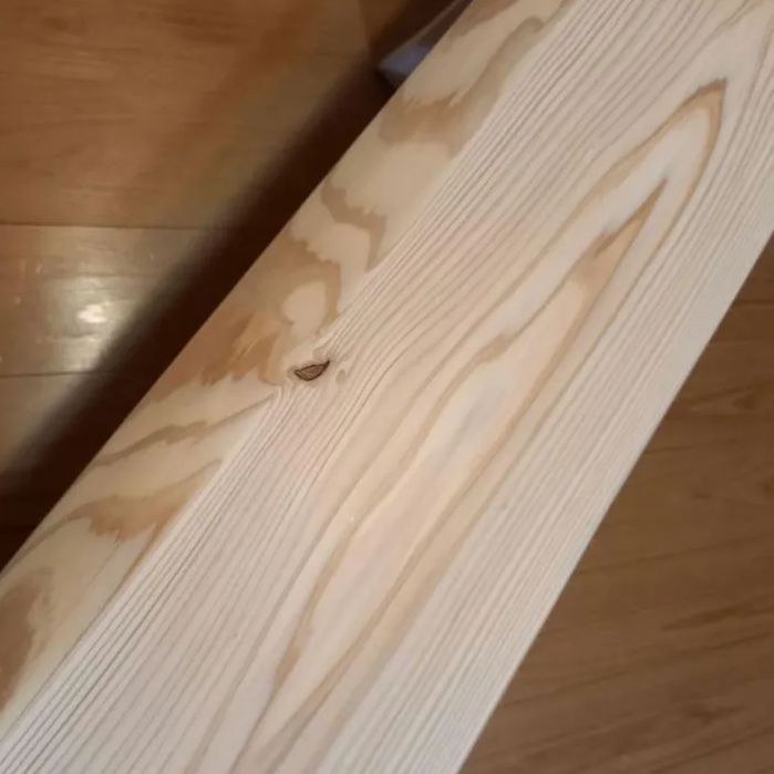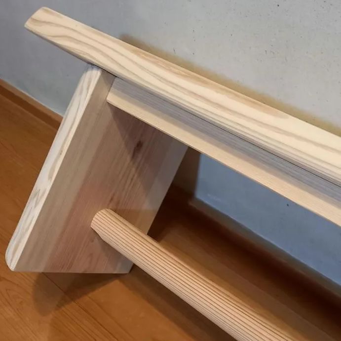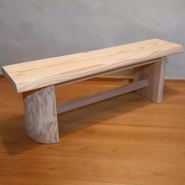・少し低いタイプのベンチ。白い節の有る材を天板に採用。シンプルなベンチに仕上がりました🌳