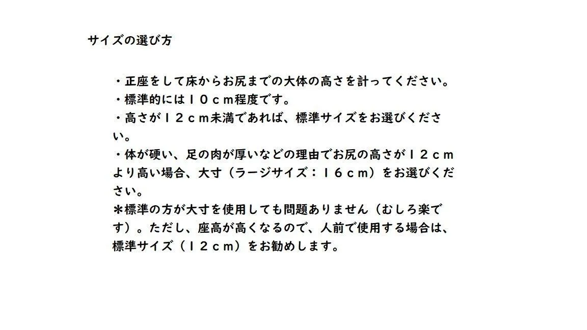 適正サイズは、身長・体重だけでなく、体の柔軟性や正座時のお尻の高さ(足の厚み)によって決まります。「標準(12cm)」と「ラージ(16cm)」の2種類をご用意しています。「思ったより大きい/小さい」を防ぐため、必ず商品画像のサイズガイドと商品説明の実寸法をご確認の上、ご購入ください。