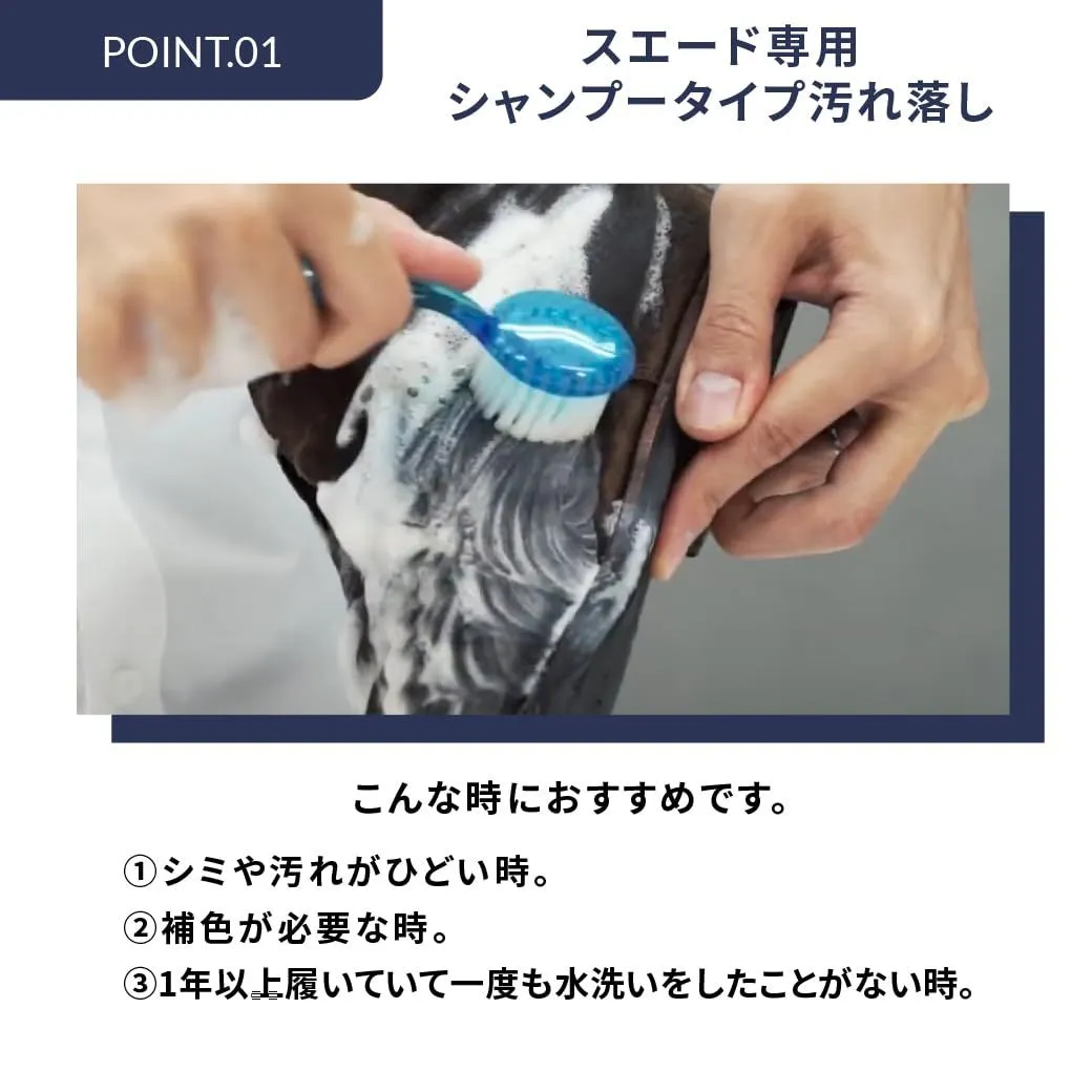 こんな時にご使用ください 11.スエード・ヌバックについた雨のシミや汚れをきれいに落とします。 2.足からでる汗が皮革に入り込み、塩浮きした状態の皮革をきれいにできます。 3.深く入った靴の履きシワを伸ばし、型崩れを直します。