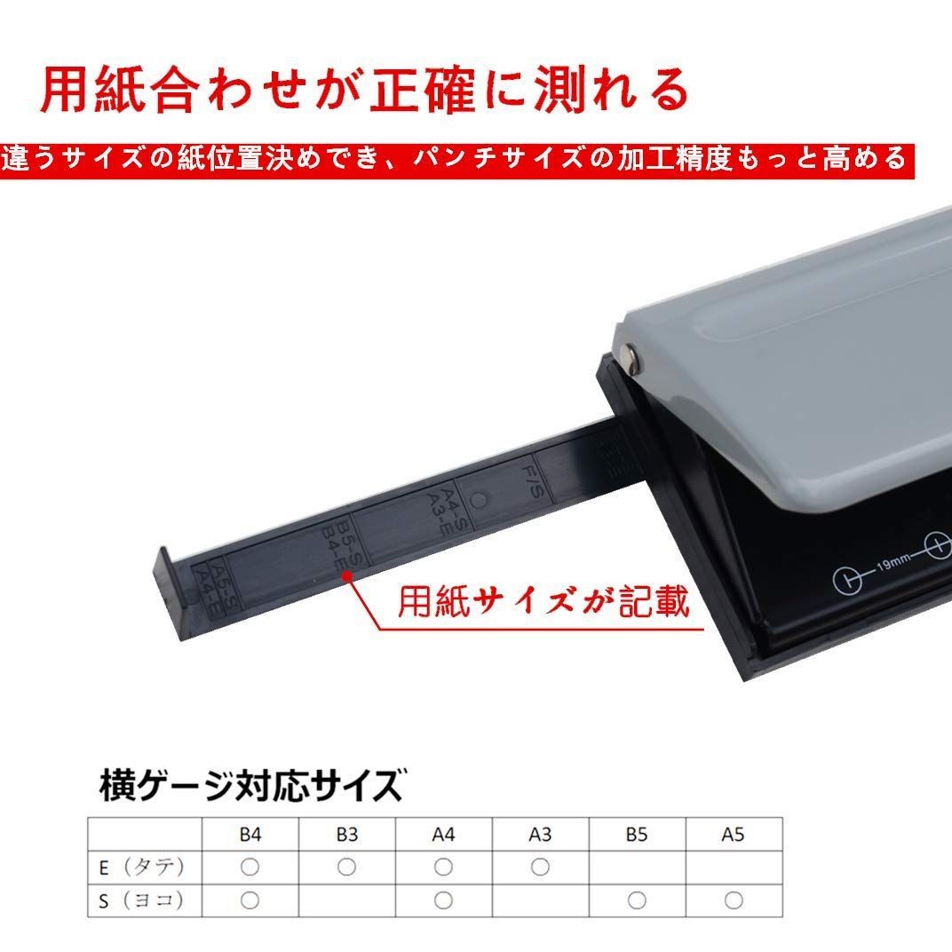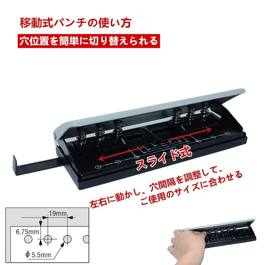【使いやすい】パンチ枚数:6枚、使い方法:用紙を半分に折り、中央の折れ線を穴あけ機の中間ラインに合わせ、穴位距離( 19mm/38mm/51mm/70mm)を選び、ハンドルを押して、穴を開けます