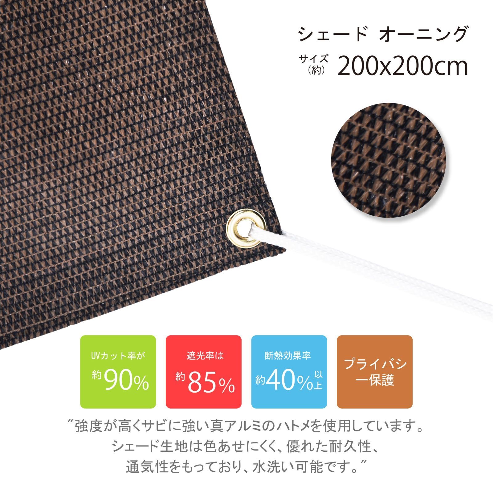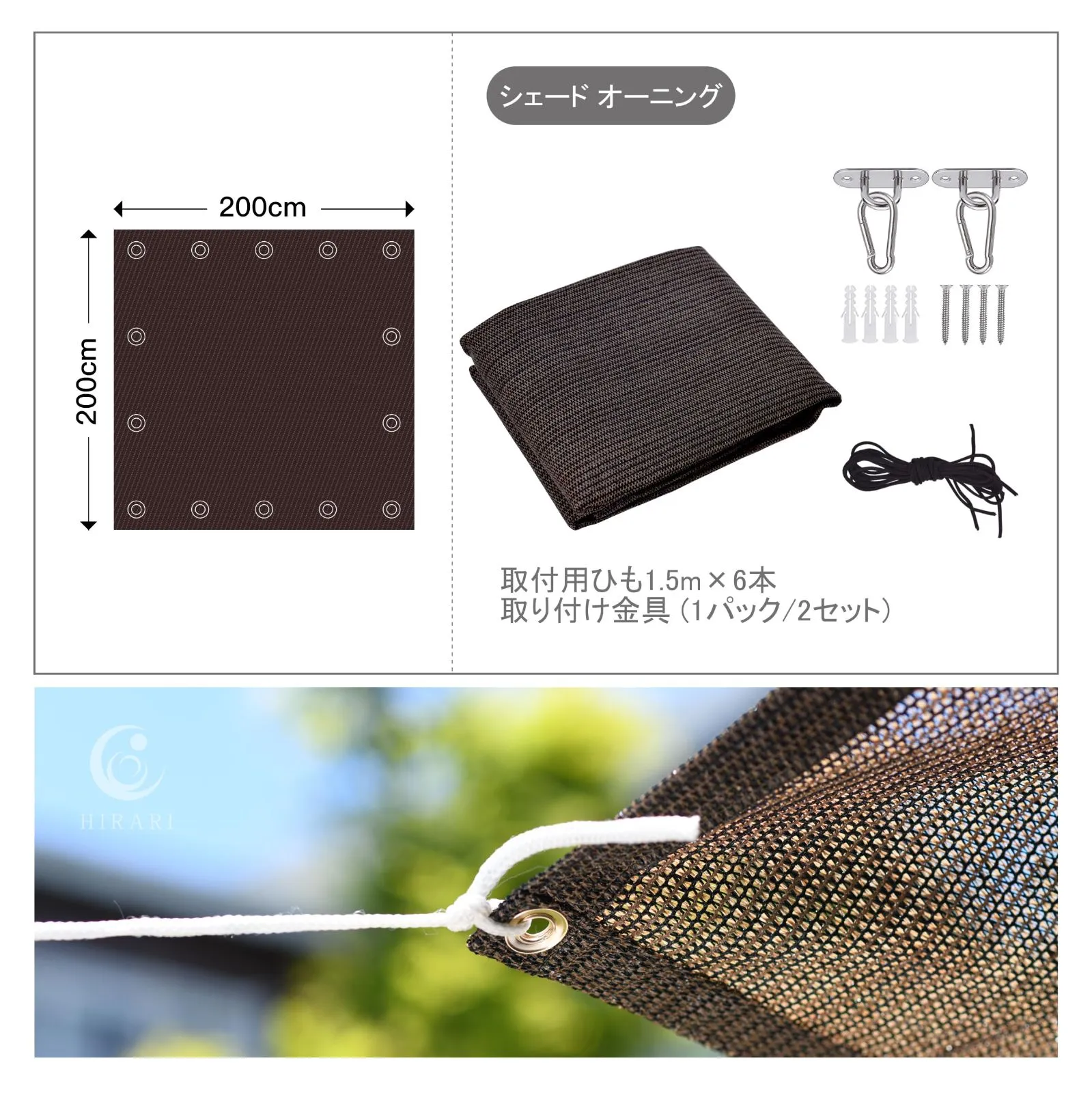 HIRARI 日よけ シェード ベランダ 日除け シェード オーニング サンシェード 200×200cm モーカ(パッドアイ 金具含む)