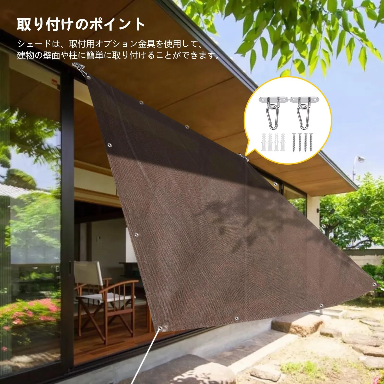 付属品:取付用ひも1.5m×6本、取り付け金具 (1パック/2セット)。廊下、庭下、庭先、玄関などに簡単に取り付けることができます。お洒落なデザインなので、日よけだけでなく、ご自宅やお庭のエクステリアとしてもご利用なれます。