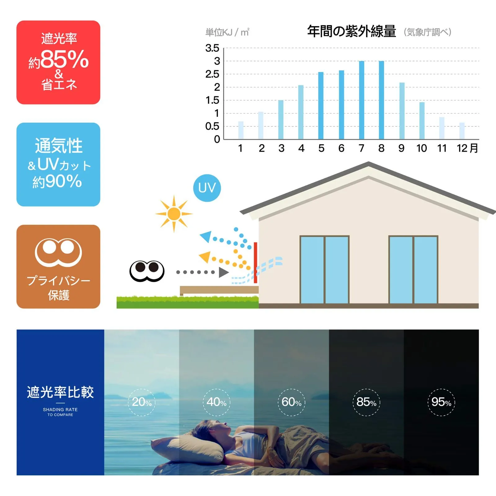 紫外線UVカット率が90%以上,遮光率は約85%。紫外線に強い、色褪せや紫外線劣化に強い糸で織られた生地を使用。