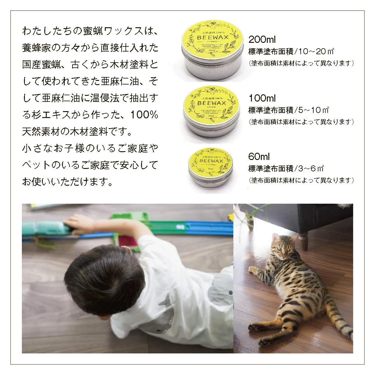 長野、岐阜、北海道で採れた国産蜜蝋、亜麻仁油、杉エキスによる100%天然素材で製造した蜜蝋ワックスです。小さいお子様がいるご家庭でも安心してお使いいただけます。
