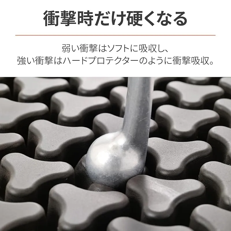 衝撃が加わったときに瞬間硬化する特殊な発泡ウレタン。弱い衝撃時はソフトに吸収、強い衝撃時には硬く吸収