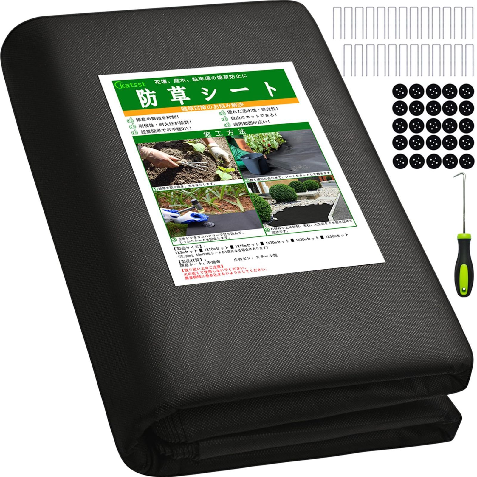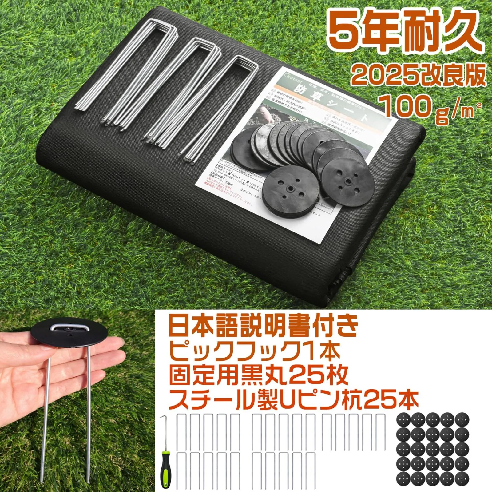 【2025年改良版 100g/m2】スチール製Uピン杭25本+黒丸25枚+ピックフック1本で合計51点セットです。材質:ポリプロピレンスパンボンド不織布(耐侯剤配合) サイズ:1m×10m;両面使用可能