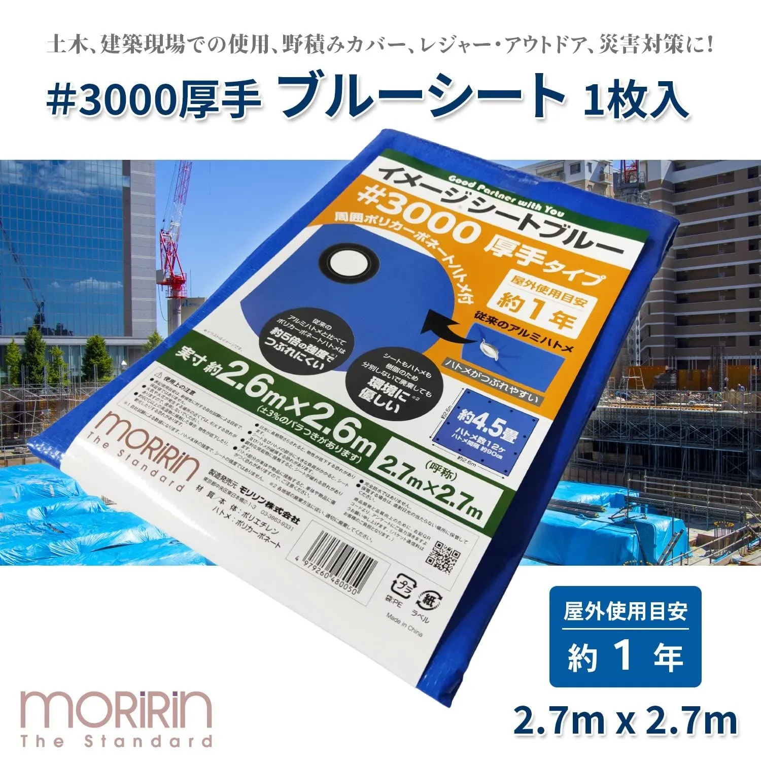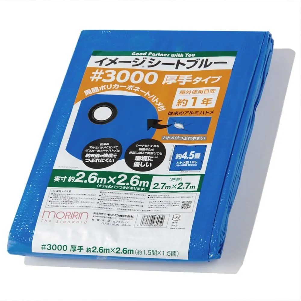 [モリリン] ブルーシート イメージシートブルー #3000 厚手 2.7×2.7m ポリカーボネートハトメ 使用目安約1年 1枚入