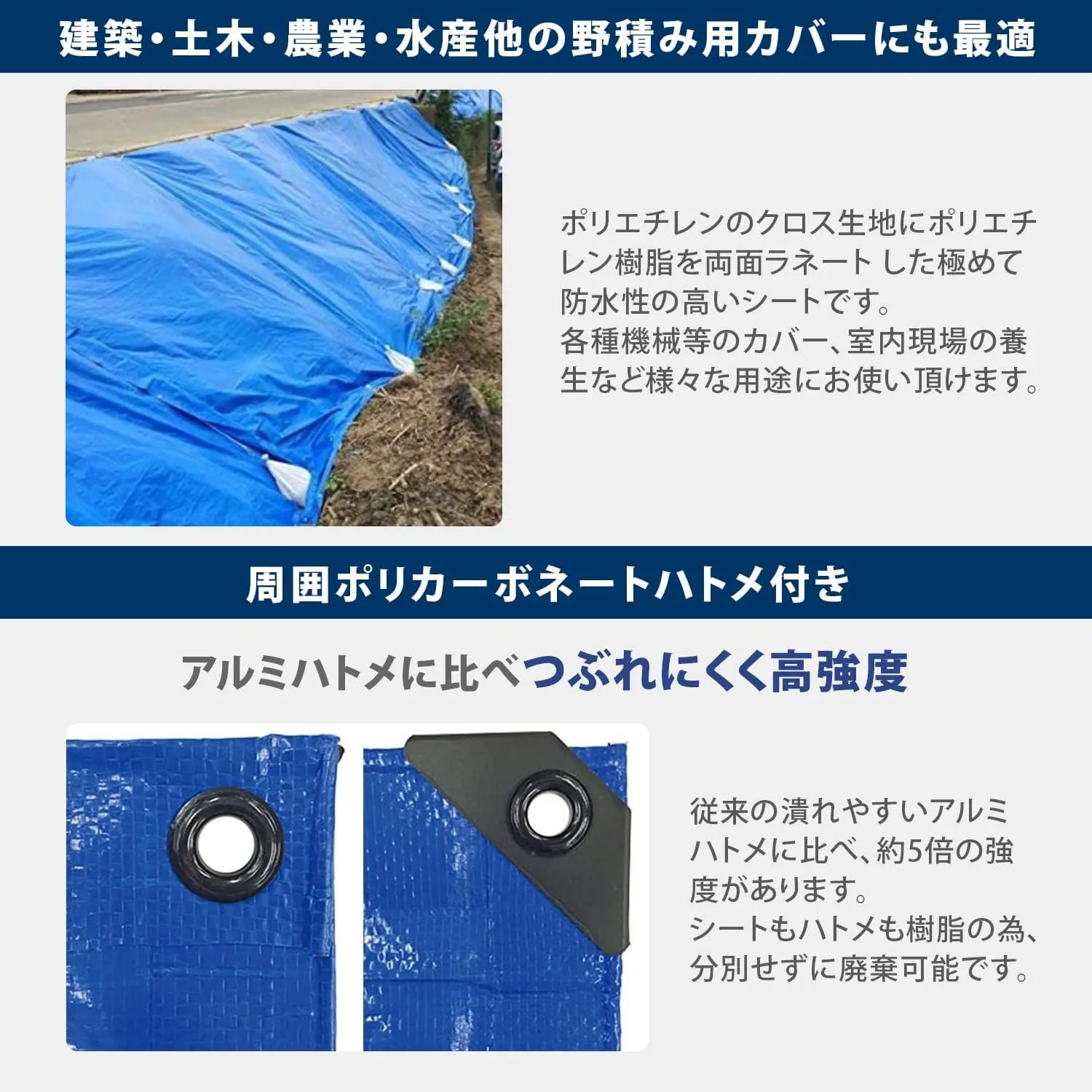 [仕様]#3000厚手、材質:ポリエチレン(本体)、ポリカーボネート(ハトメ)、ハトメ数12ヵ所、ハトメ間隔約90㎝。