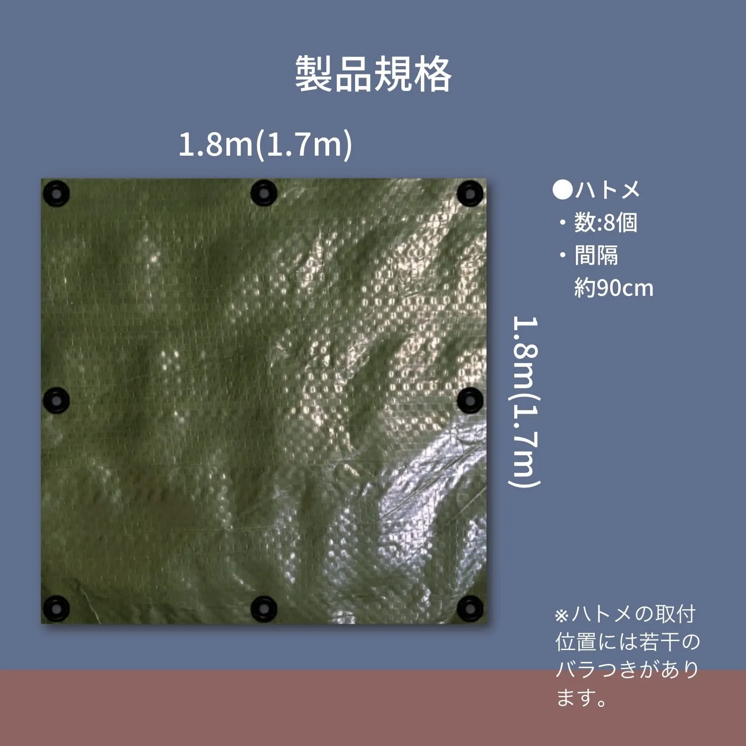 【製品仕様】シート:ポリエチレン ハトメ:ポリエチレン シート厚み:0.17㎜ シートサイズ:1.8m×1.8m(仕上:1.7m×1.7m) ハトメ内径:約12㎜ ハトメ間隔:約90cm ハトメ個数:8個