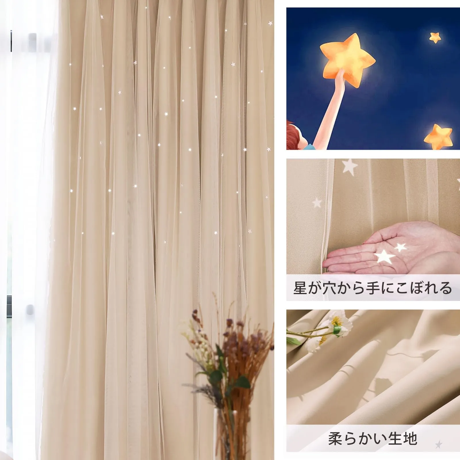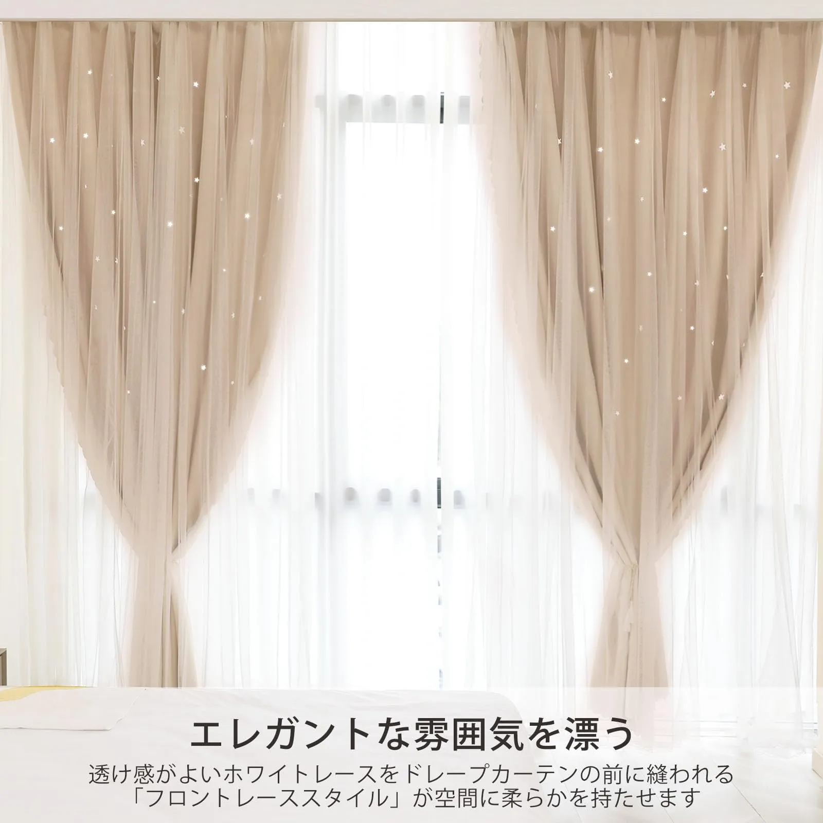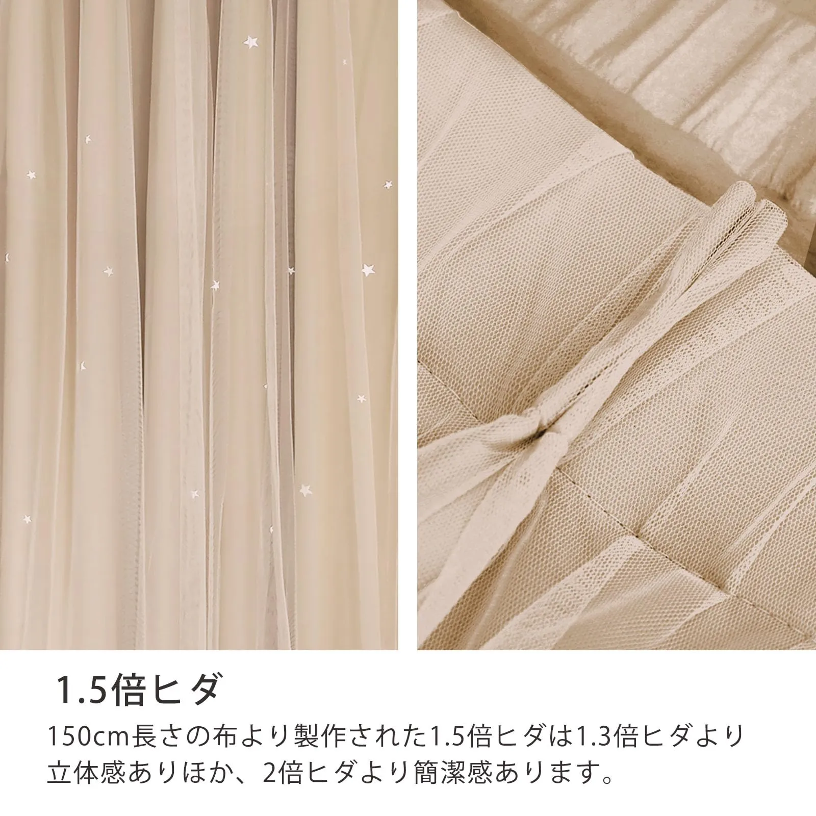 カーテン 姫系 遮光 レースカーテン付き 2枚組 丈100cm×幅100cm 一体型 二重 星柄 おしゃれ 厚手 フック付き タッセル付き 取付簡単 すぐ使える アジャスター付き 遮熱 保温 小窓/出窓用 掃き出し窓 腰窓 子供部屋 女の子 幼稚園 洗濯可能 ベージュ