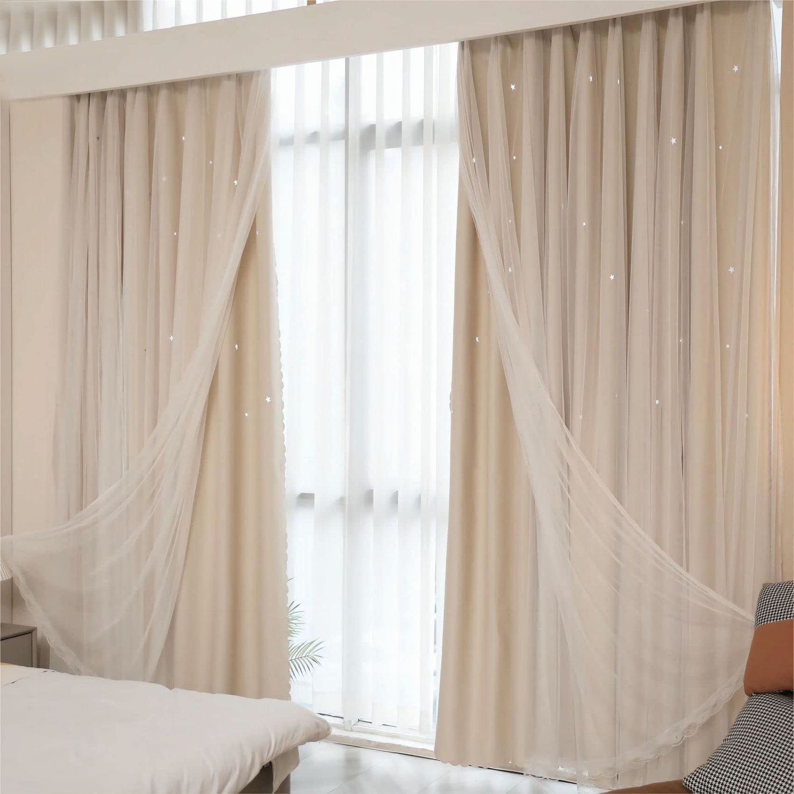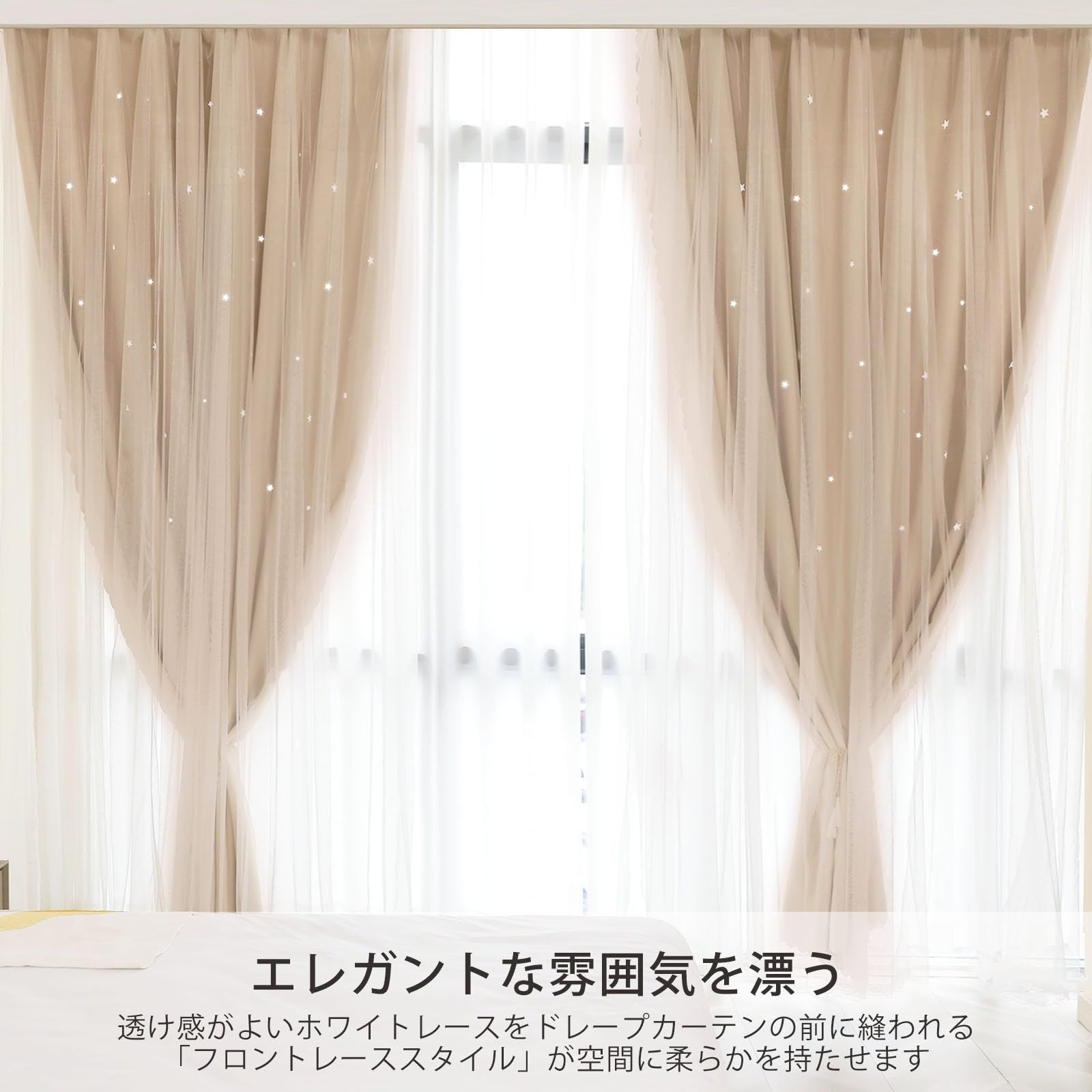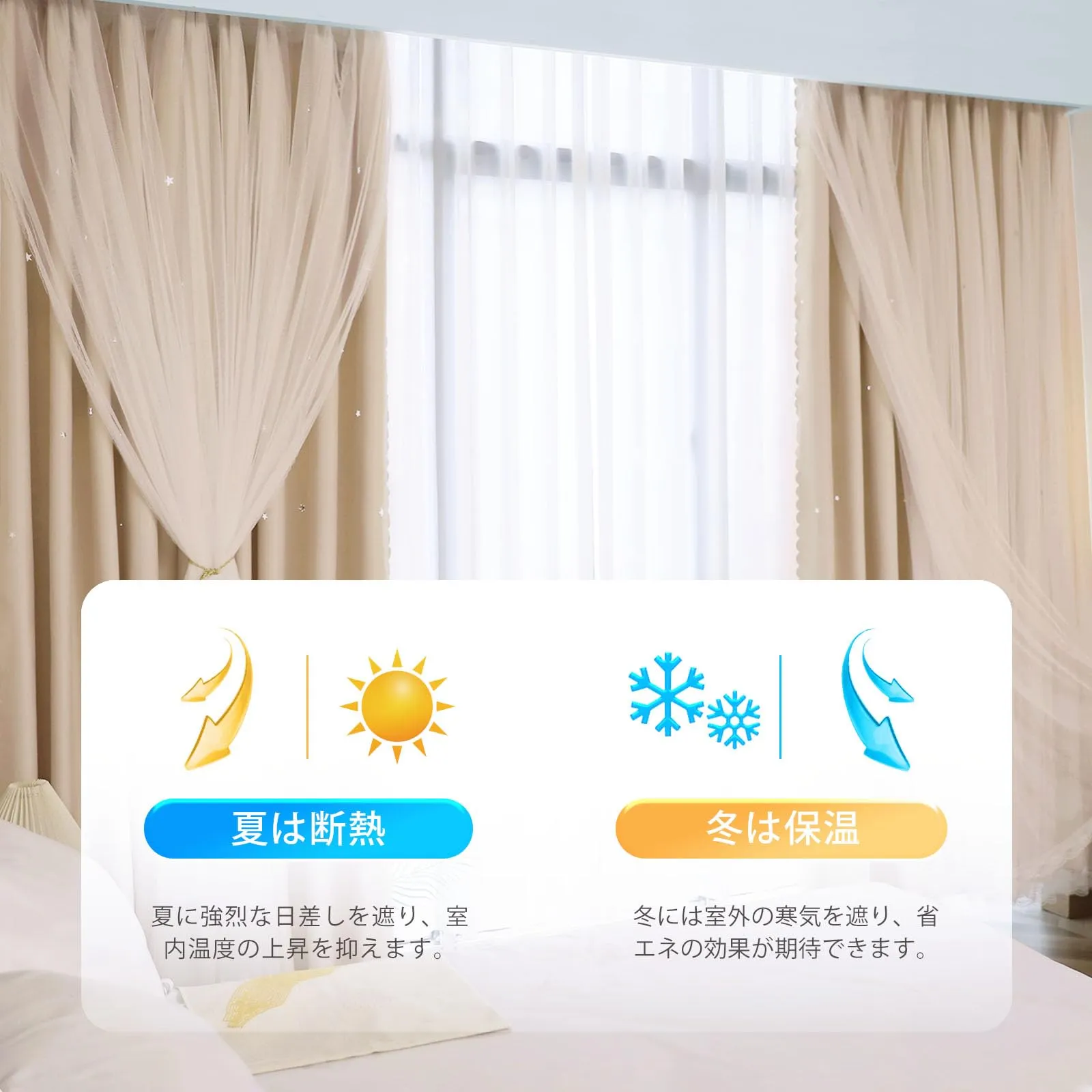 カーテン 姫系 遮光 レースカーテン付き 2枚組 丈100cm×幅100cm 一体型 二重 星柄 おしゃれ 厚手 フック付き タッセル付き 取付簡単 すぐ使える アジャスター付き 遮熱 保温 小窓/出窓用 掃き出し窓 腰窓 子供部屋 女の子 幼稚園 洗濯可能 ベージュ