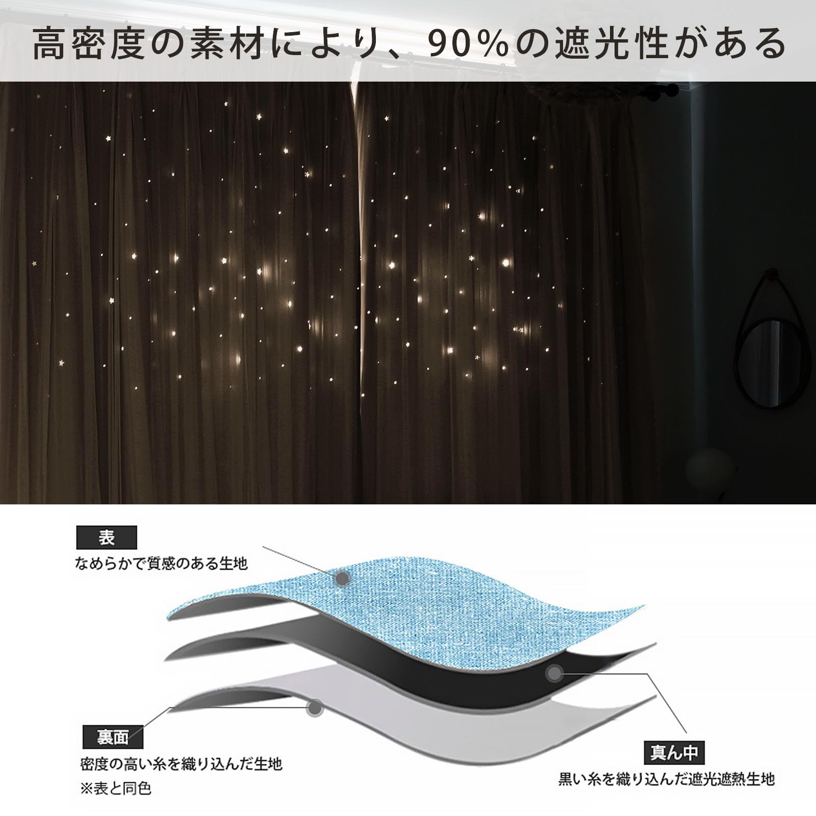 【透かし彫りのデザイン】北欧系のドレープカーテンにレーザー切断の技術で星柄を彫り出して、日差しが柄なから透かして星になり、壁、ベッドや家具に散らして、まるで星空が部屋にこぼれるようにロマンティックな雰囲気を作り出します。さらに、ふわふわのレースカーテンを付けるので、部屋をもっと爽やかで明るくします。新築お祝いや結婚お祝いや引越しお祝いなどのプレゼントとしても相手に喜ばせます。