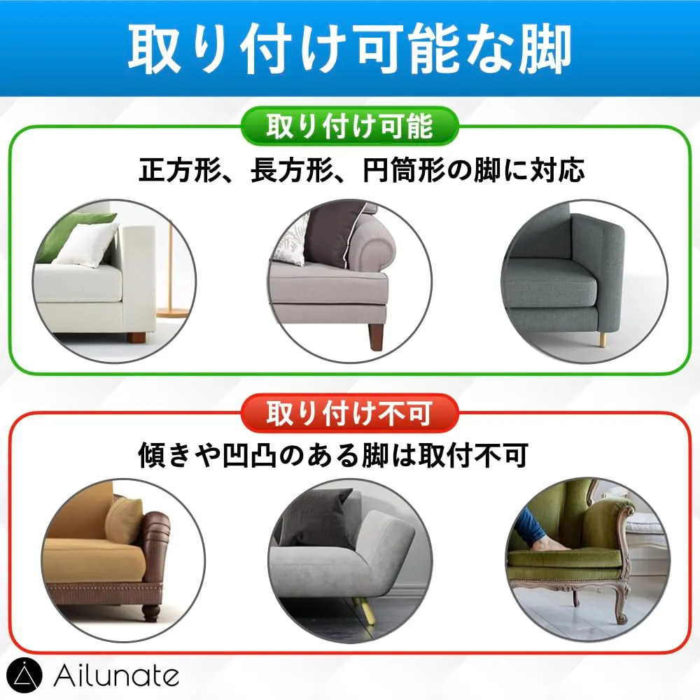【取り付け可能な脚】正方形や長方形、円筒形の脚に取り付けることができます。両面テープで貼り付けるためデザイン性のある凹凸のある脚には取り付けができません。また、隙間テープを床面と並行に設置するため、傾きのある脚には設置することができません。設置家財の脚の形状をご確認ください。