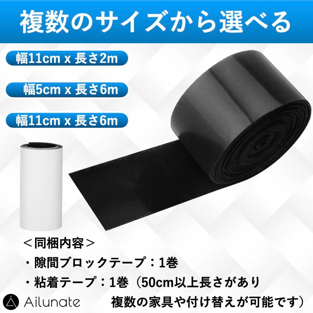 【同梱内容】隙間ブロックテープ:1巻、粘着テープ:1巻(50cm以上長さがあり複数の家具や付け替えが可能です)