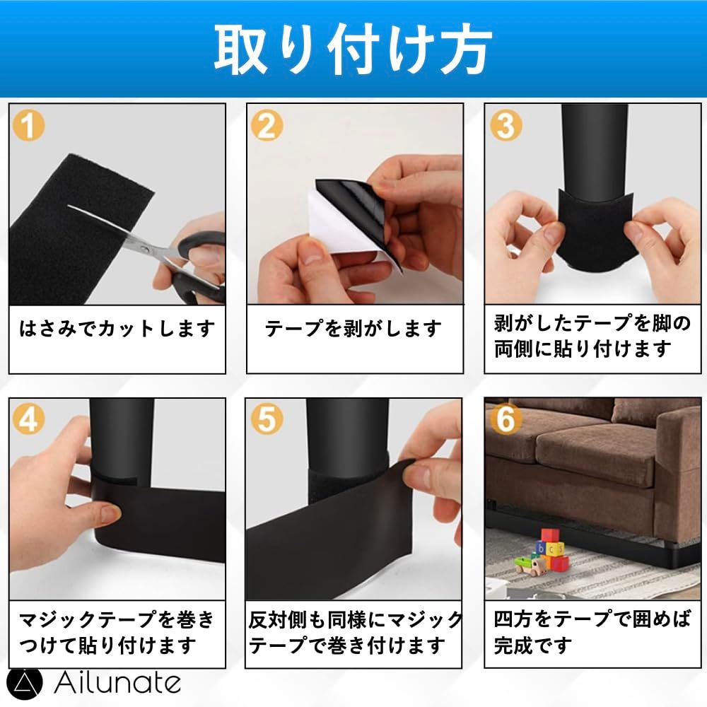 【取り付け方】1、付属の粘着テープをカットします。2、カットした粘着テープを剥がします。3、粘着テープの粘着面を両脚に貼り付けます。4、片側の脚に貼り付けた粘着テープと隙間ブロックテープをマジックテープで貼り合わせます。5、もう一方の脚も同様にマジックテープテープで貼り合わせます。6、四方を隙間ブロックテープで囲めば完成です。