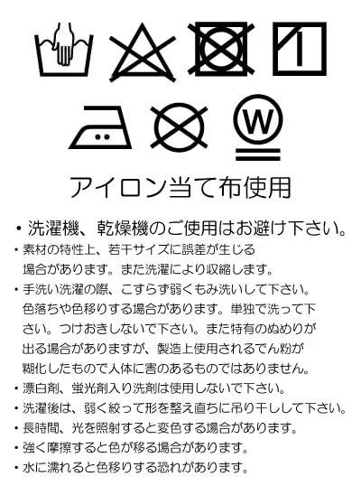 洗濯時は洗濯機、乾燥機のご使用はお避け下さい。また洗濯により収縮します(5~8%)。洗濯後、アイロンを掛けたり、吊った状態にするとサイズが伸縮する場合があります。手洗い洗濯の際、こすらず弱くもみ洗いして下さい。色落ちや色移りする場合があります。単独で洗いつけ置きしないでください。洗濯時に特有のぬめりが出る場合がありますが、製造上使用されるでん粉が糊化したもので人体に害のあるものではありません。漂白剤、蛍光剤入り洗剤は使用しないで下さい。洗濯後は、弱く絞って形を整えたたちに吊り干ししてください。長時間、光を照射すると変色する場合があります。強く摩擦すると色が移る場合があります。水に濡れると色移りする恐れがあります。