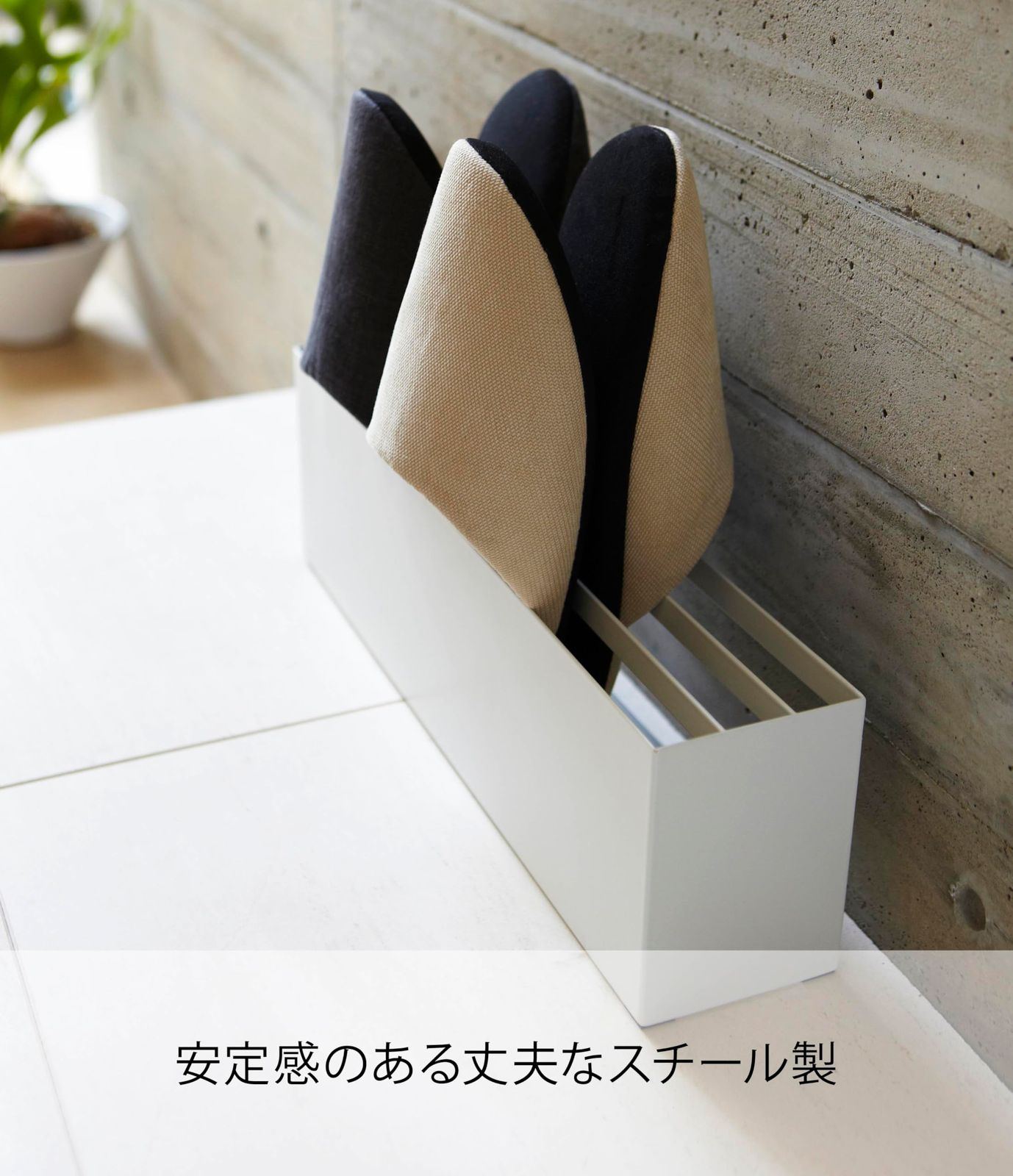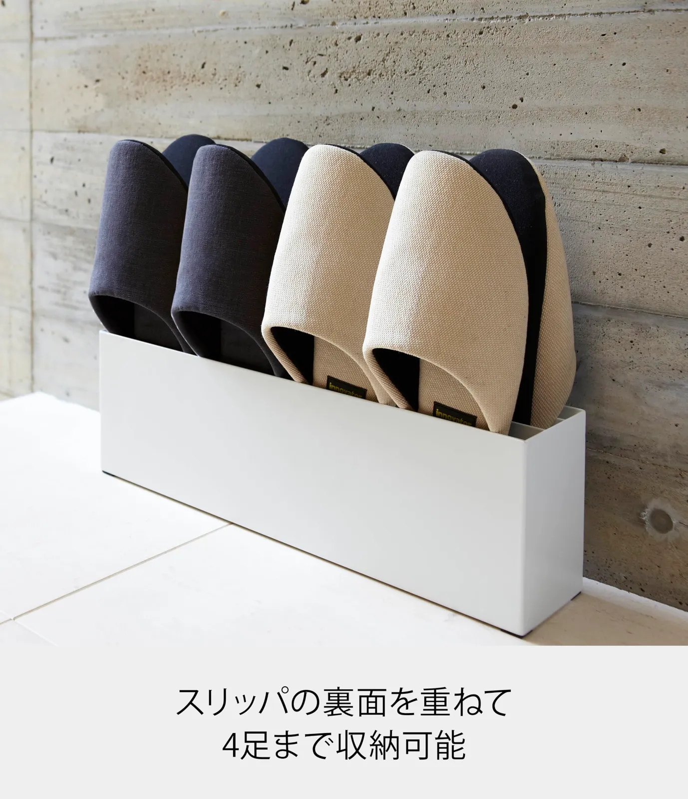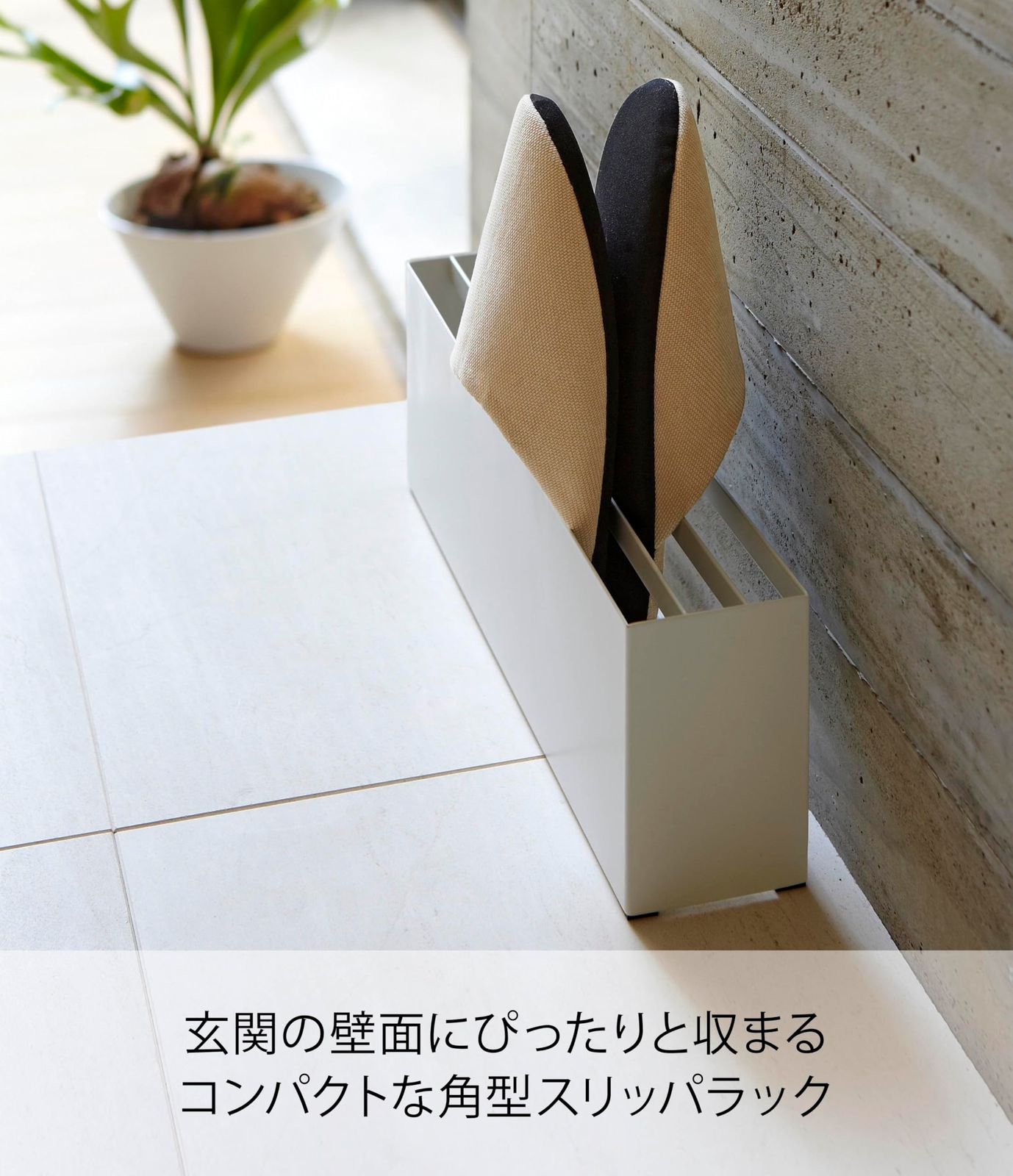 山崎実業(Yamazaki) スリッパラック スマート ホワイト 7643 色:ホワイト 横置きのスリム設計 スリッパの裏面を重ねて4足収納できます。 玄関の壁にぴったりと収まる コンパクト角型のスリッパラック より
