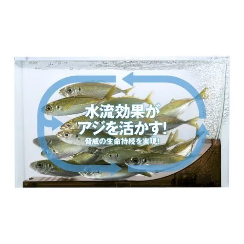 ■MEIHO独自のサイクロン方式を採用することで驚異の生命維持力を実現。サイクロン方式で発生した水流が渦を描くように回り、魚が一方向に向くため、たった10Lの容量で25匹程度の小アジを活かすことが可能。O2パワーを入れることで、さらに効果的!!