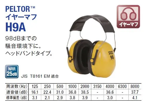 3M 防音 イヤーマフ JIS適合品 PELTOR ヘッドバンド式 H9A JIS規格に適合する、3Mの防音保護具(イヤーマフ)です。 98dB までの騒音環境下に。 ヘッドバンドタイプ JIS T8161 EM 適合 イヤーマフのスタンダードタイプ。