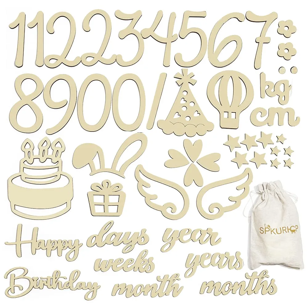 【セット内容】合計49枚セット、0*2枚、1*2枚、2*2枚、3~9各1枚、王冠*1枚、花*2枚、羽*2枚、ハート*4枚、ケーキ*1枚、ギフト*1枚、ウサギ耳*1枚、点*2枚、斜線*1枚、星*10(2サイズ)、kg、cm、happy、birthday、days、weeks、month、months、year、years各一枚、合計49枚、サイズ:写真欄にご参照ください。素材:ウッド、厚さ:約4mm