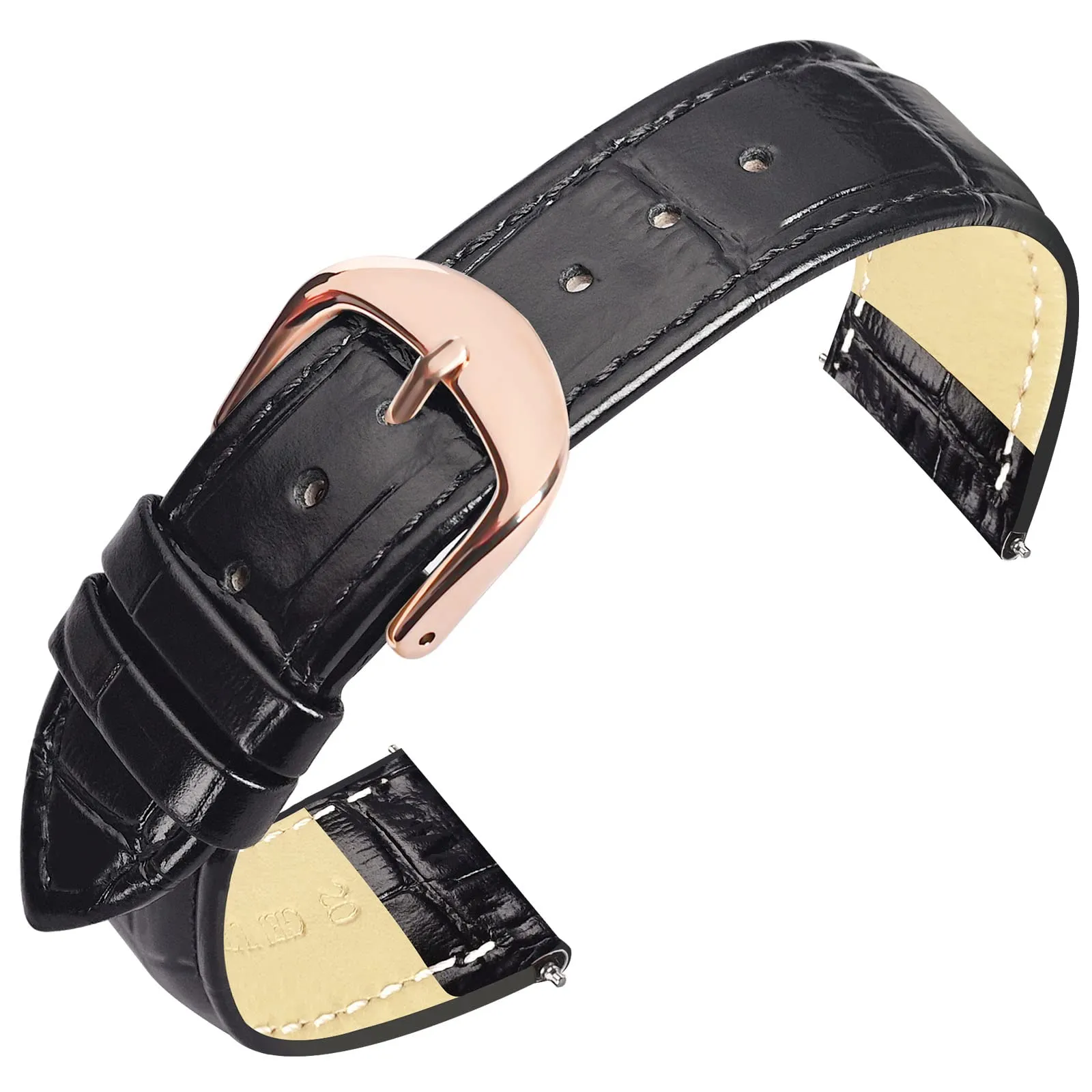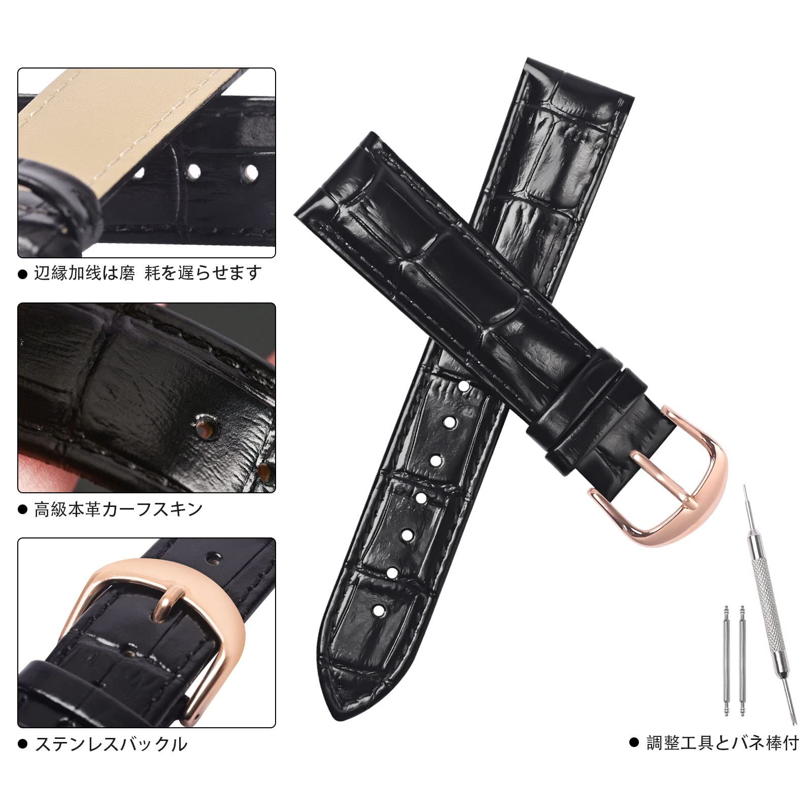 時計バンドベルト18mm 20mm 22mm カーフレザーメンズ レディース全3色交換ベルト 調整工具とバネ棒付(20mm,黒+ローズゴールドバックル)