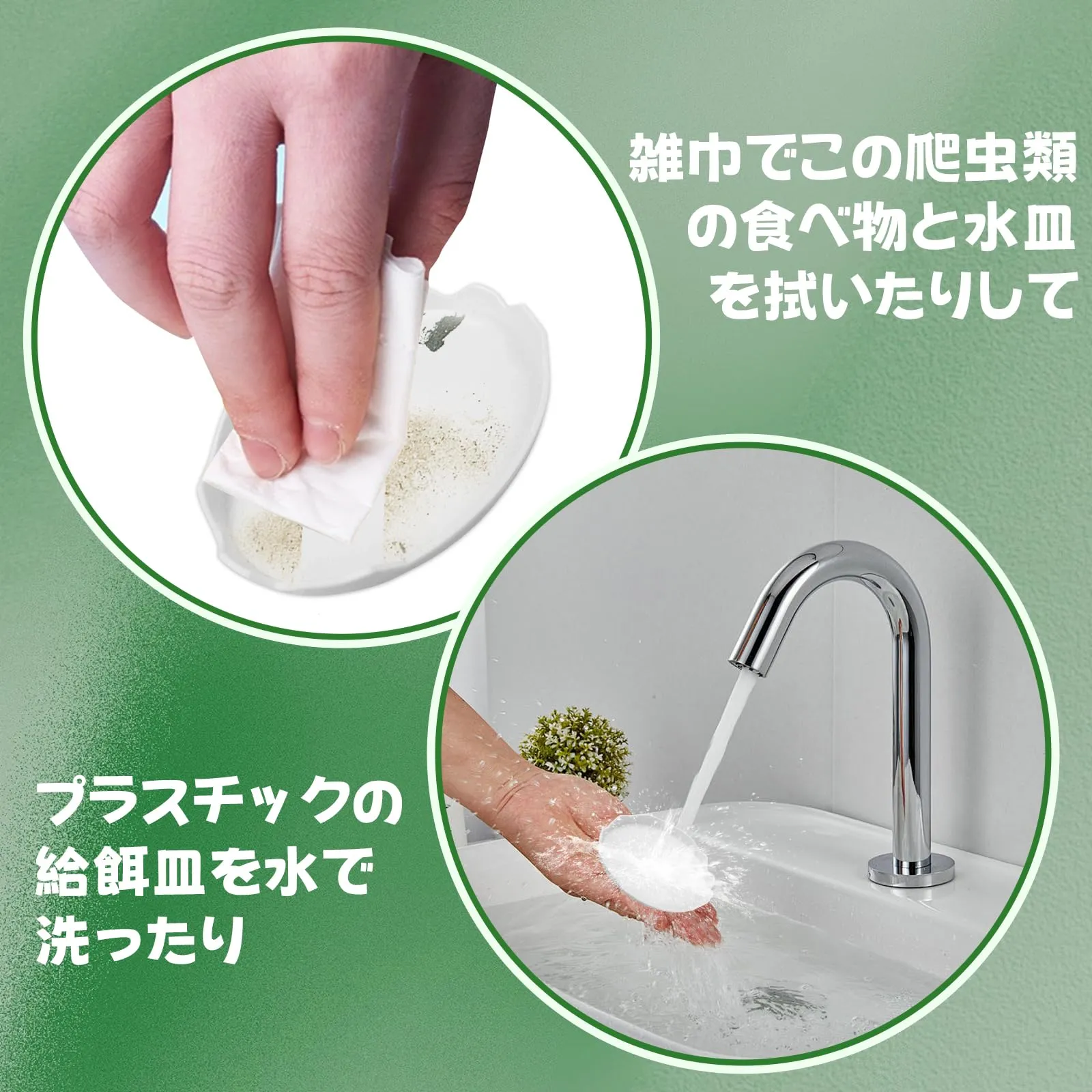 【お手入れ方法】表面は滑らかで、ペットを傷つけることはありません。プラスチックの給餌皿を水で洗ったり、雑巾でこの爬虫類の食べ物と水皿を拭いたりして、乾かしたりすることができます。