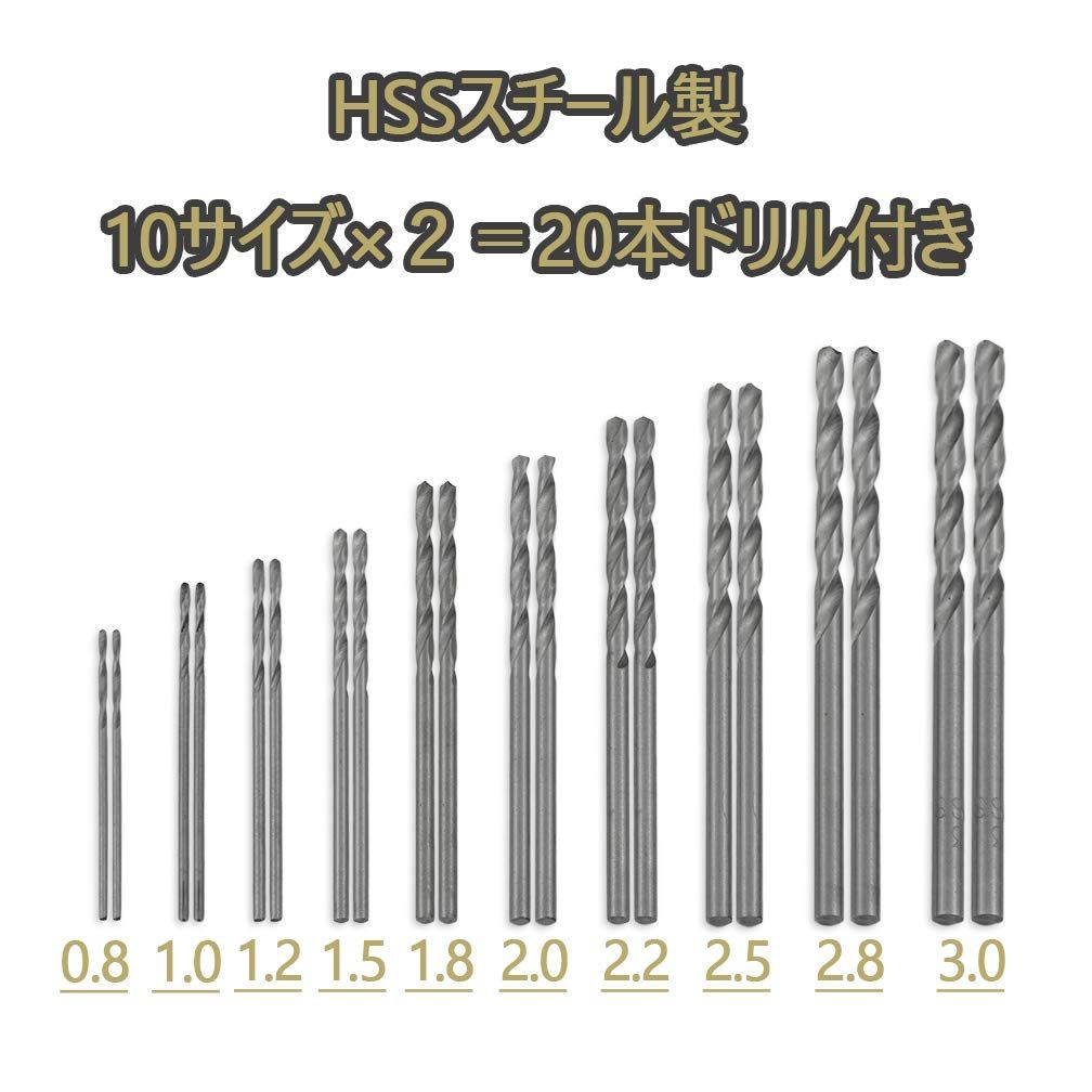 HSSスチール製ドリル刃10本付き:0.8mm、1mm、1.2mm、1.5mm、1.8mm、2mm、2.2mm、2.5mm、2.8mm、3mm。(金属や石のようなハードなものにはご使用しないでください。)(※ロットによりドリルの長さが多少違い、径が異なるドリルも長さが同じに見える場合がございます、どうぞご了承・ご注意ください。)