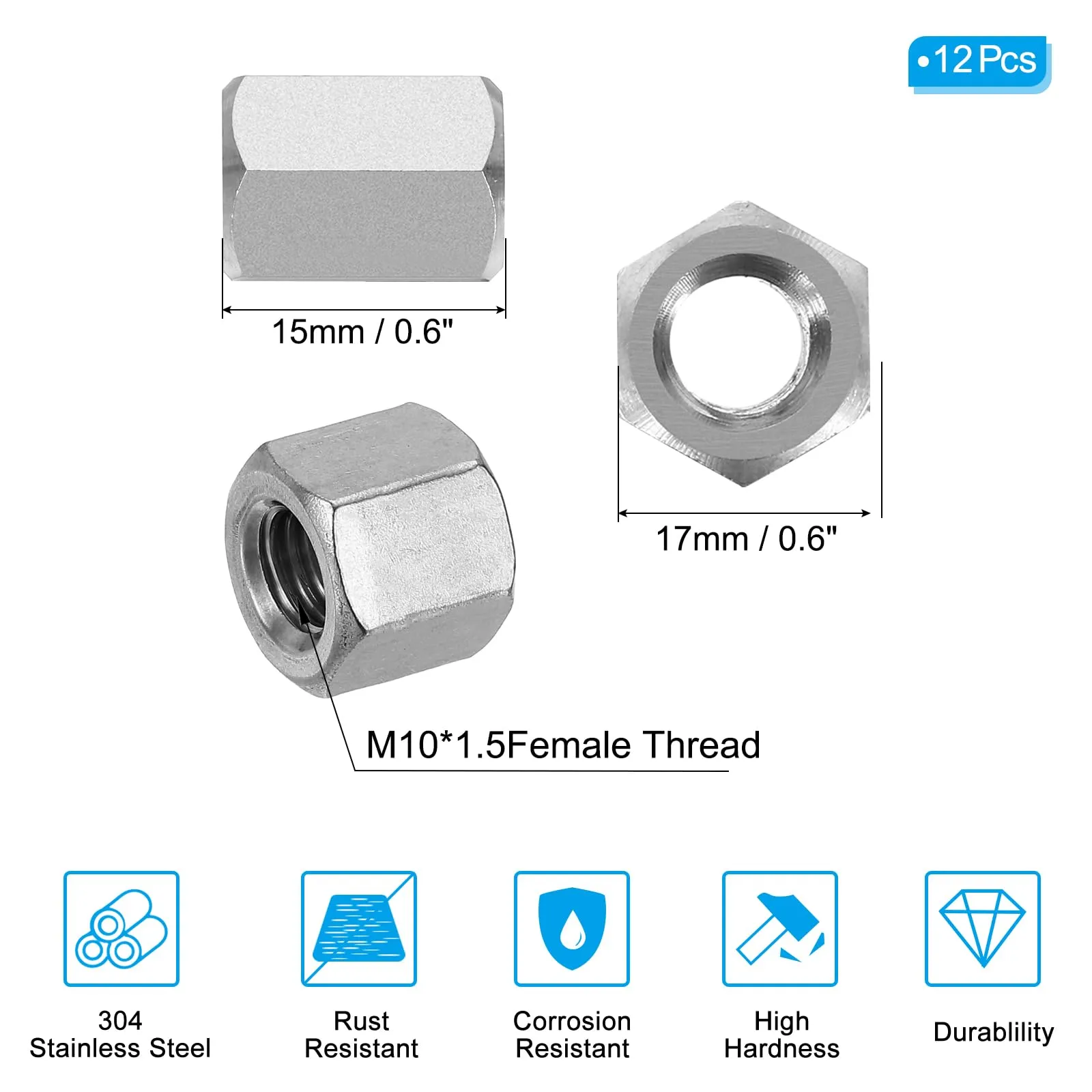 PATIKIL M10 x 1.5 高ナット 六角カップリング 12個 15mm/ 0.6 長さ粗目 完全ねじ付き ロッドカップリングナット スタッドコネクタファスナー シルバートーン