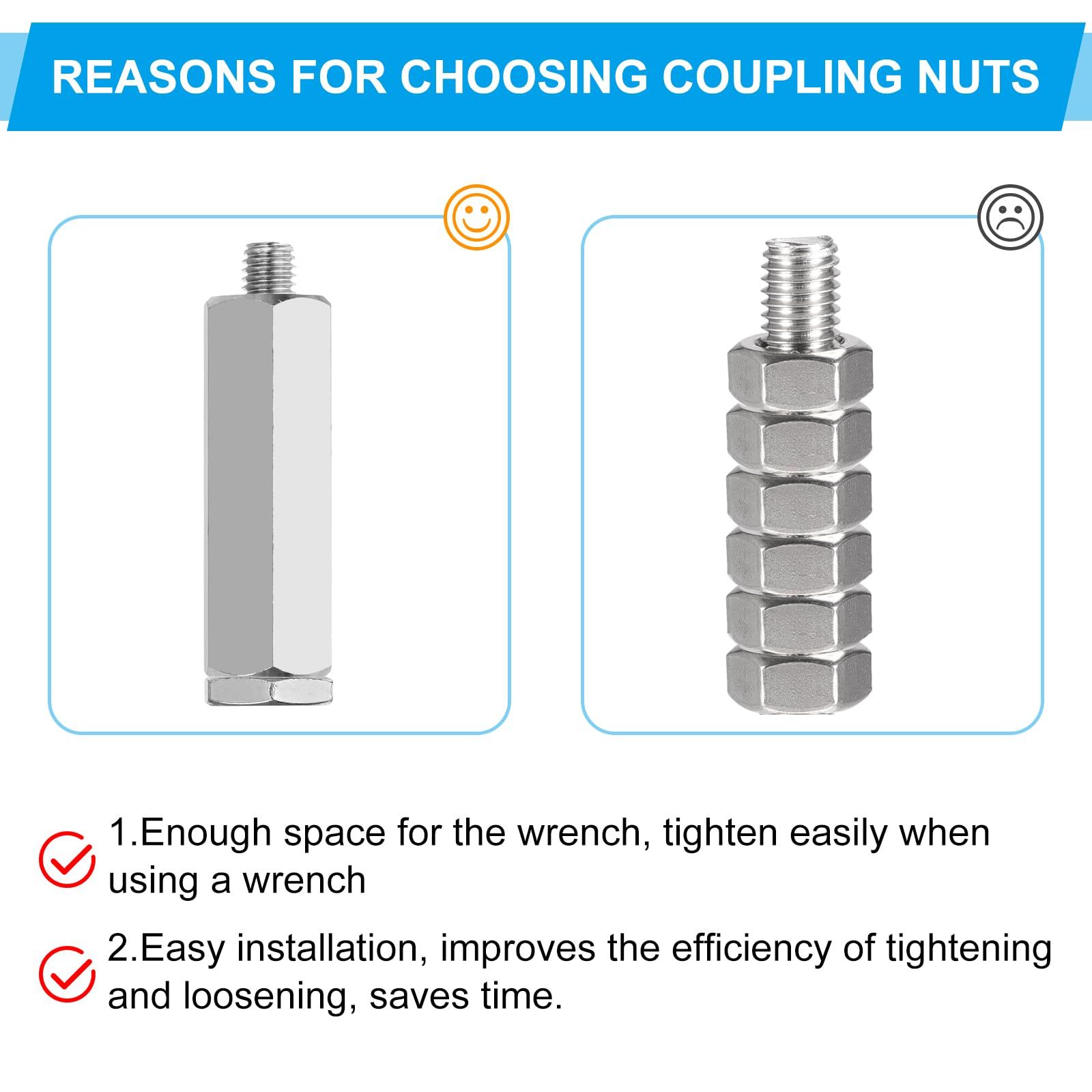 利点: 304 ステンレス鋼で作られた六角カップリングナットは、軽度の磁性があり、高硬度、高温延性、低透磁率を備え、長期使用に耐えます。化学、海洋、その他の分野で優れた耐腐食性と防錆性を備え、屋内でも屋外でも、湿った環境でも機能します。