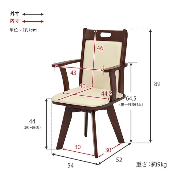 肘掛け付きで立ち座りしやすい回転式ダイニングチェア サイズ・容量