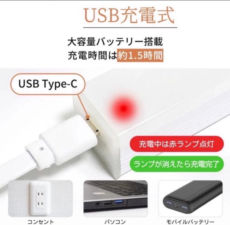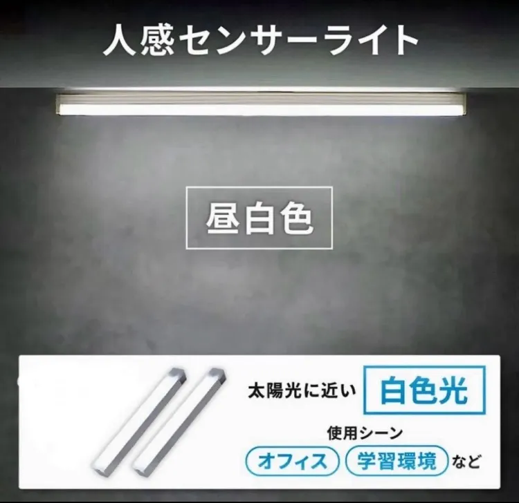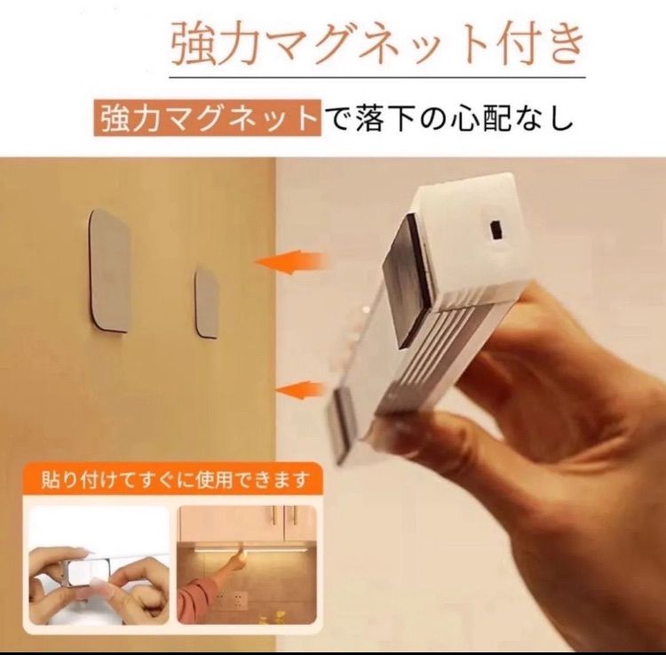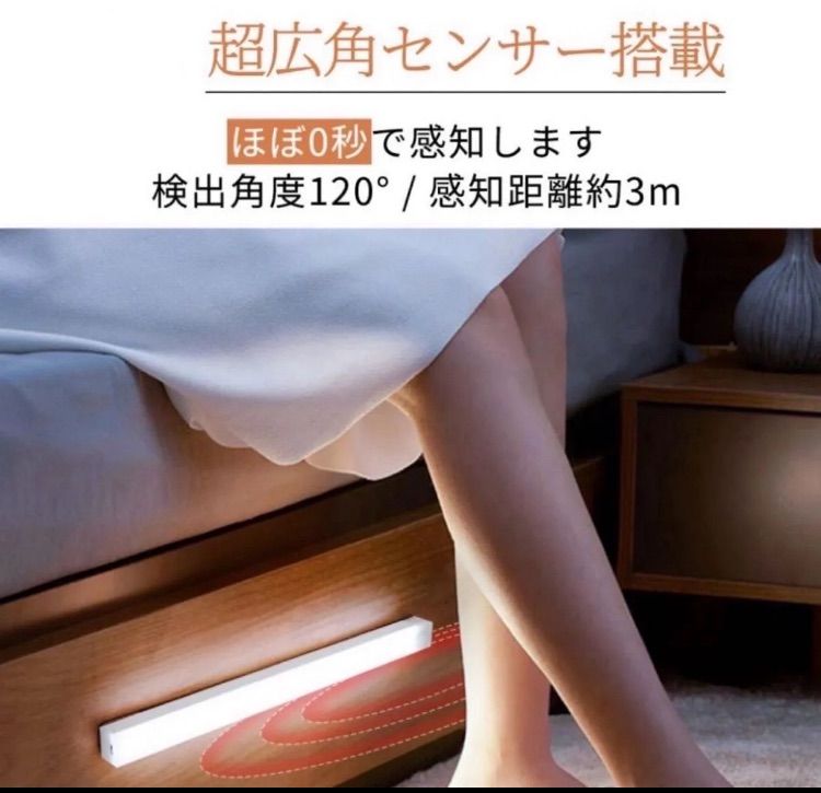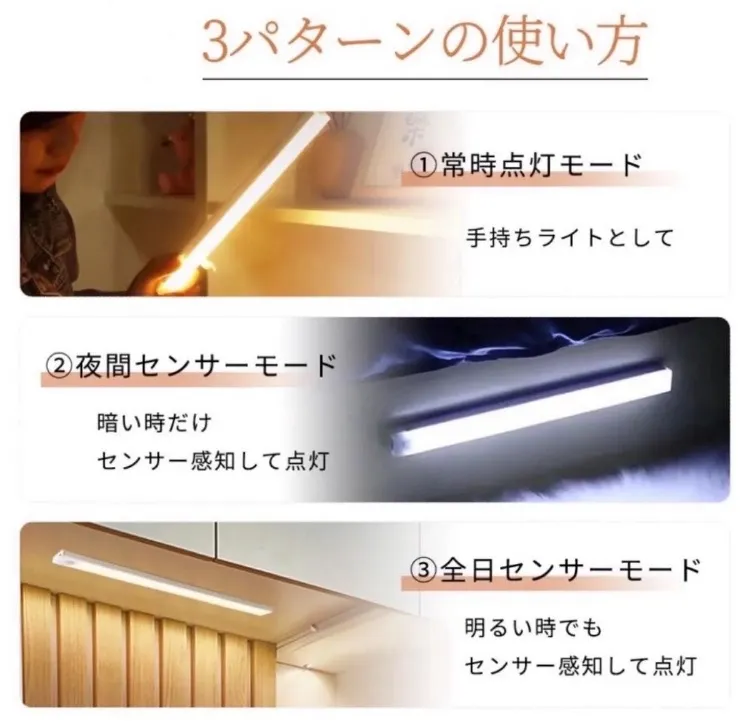 ■商品詳細 サイズ:長さ200mm、幅21mm、奥行18mm 検知範囲:距離約3~5m、検知角度約120度 付属品:センサーライト本体、充電用タイプC-USBケーブル20cm、スチールプレート2枚 充電容量:400mAh 充電時間約2時間 USB充電式人感センサーライトです。 充電器式で配線を必要としないのでどこでも付けられます。 階段やクローゼット、押し入れ、廊下の足元灯、パントリーだけでなく、車のトランク、アクリルケース内側など多種多様です 夜中にトイレへ行くときに電気のスイッチを探さなくても大丈夫です。 コンパクトですので、引き出しの中や小物入れの中でも付けられます 本体背面にはマグネットが両端に付いていますので鉄製金属面には直接設置できます それ以外の面には、付属のスチールプレートが枚ありますので、がして貼り付けてください ※センサーモードは明るい場所では反応しませんので、暗いところでご確認ください センサーモードでは、検知範囲を離れると約20秒後に自動で消灯しますので、消し忘れもありません 操作方法 1.ボタンを1回押す→常時点灯モード 2.ボタンを2回押す→暗いところで人感センサーモード 3 ボタンを3回押す→常時人感センサーモード 4.ボタンを3回押す→電源OFF