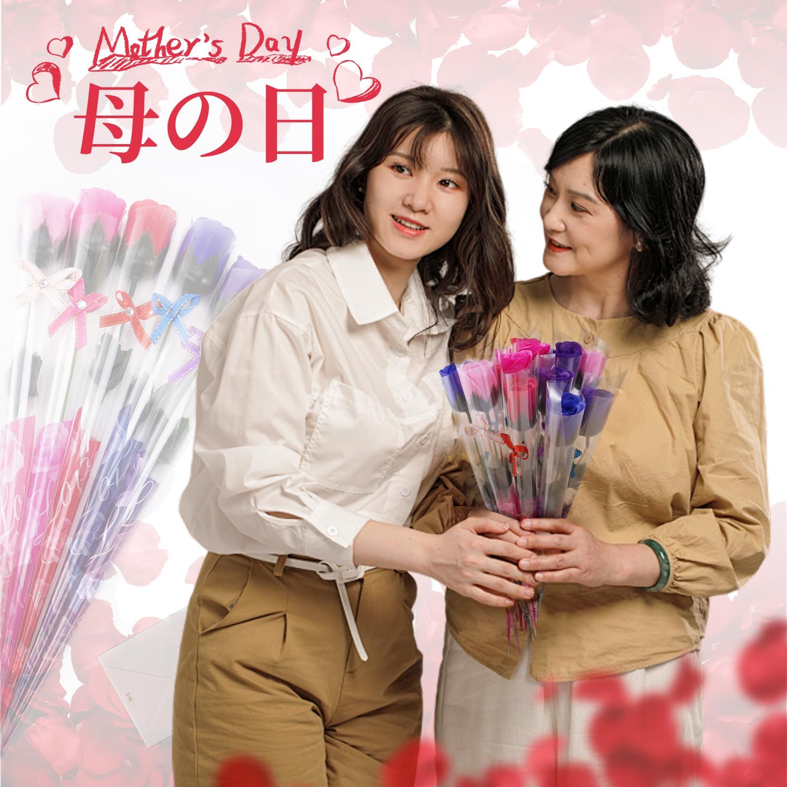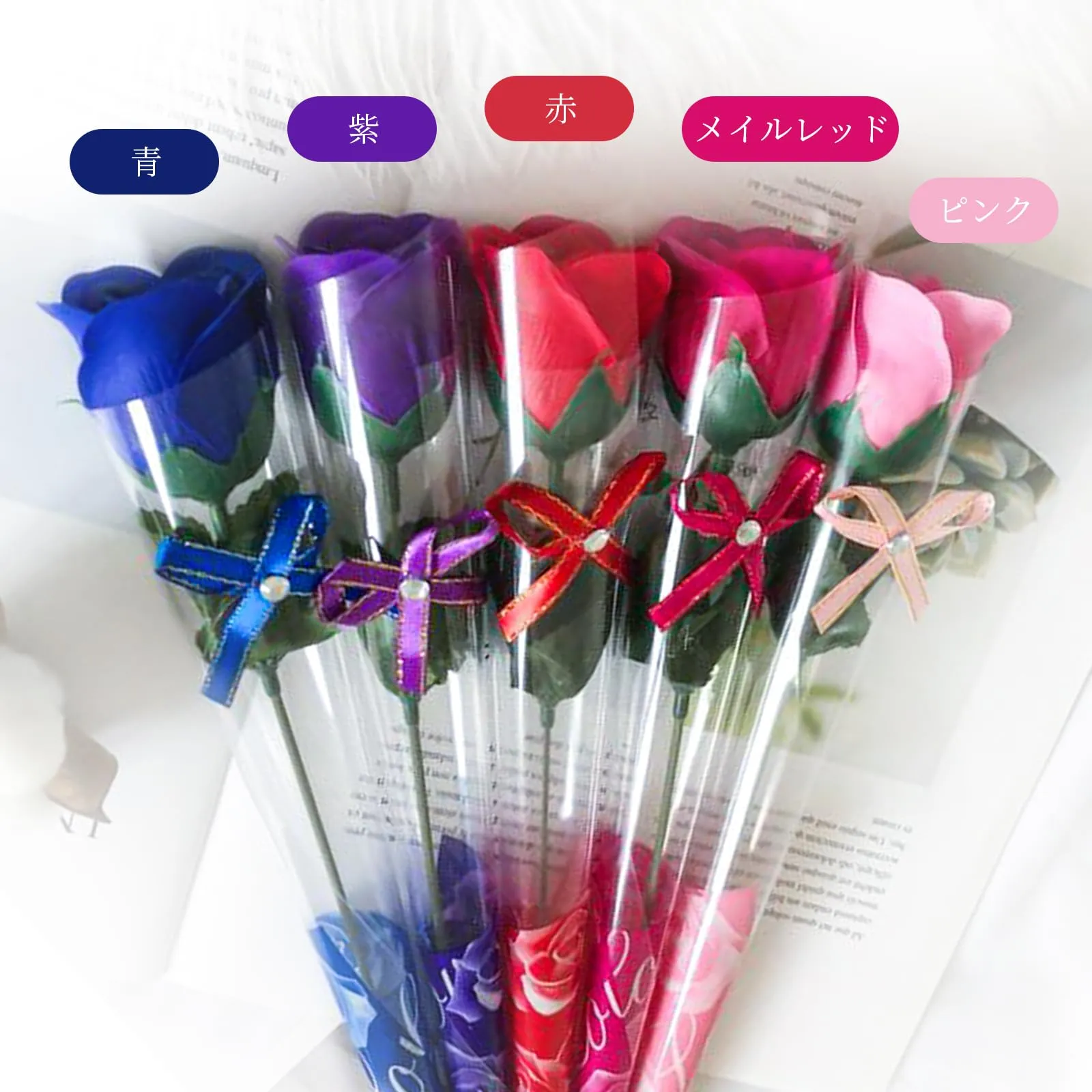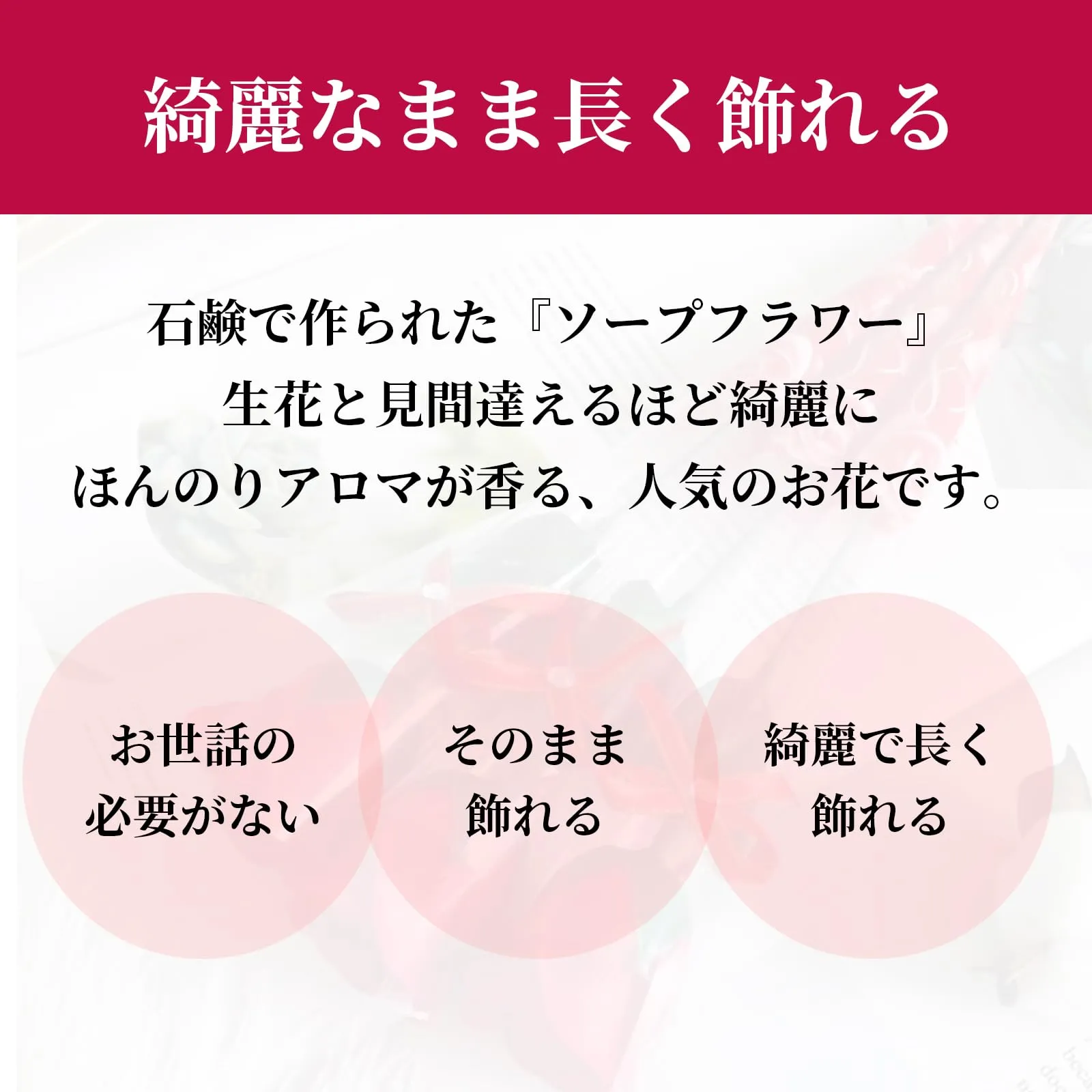 高品質な石鹸素材で作られたお花は本物と見間違えるほど美しく、 お水やりが必要ないので手入れも簡単です。1本ずつリボンをつけフィルムでラッピング済みなので、そのまま渡すことができます。