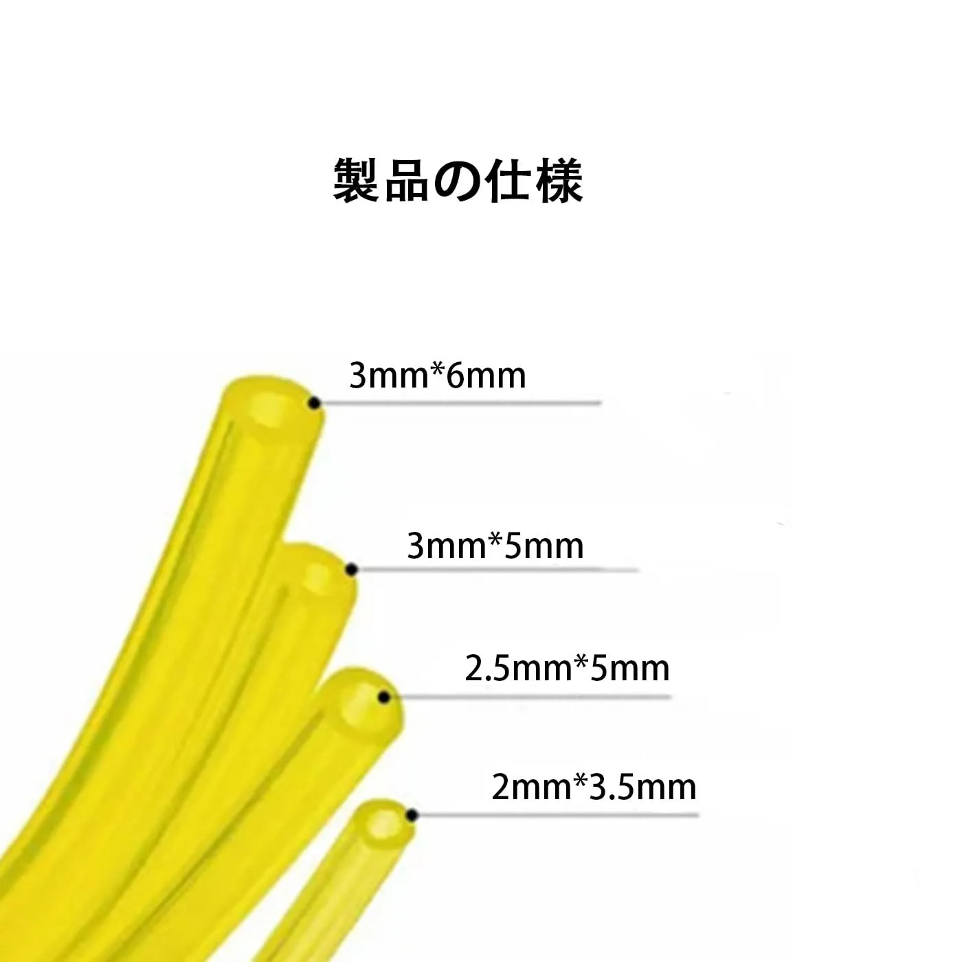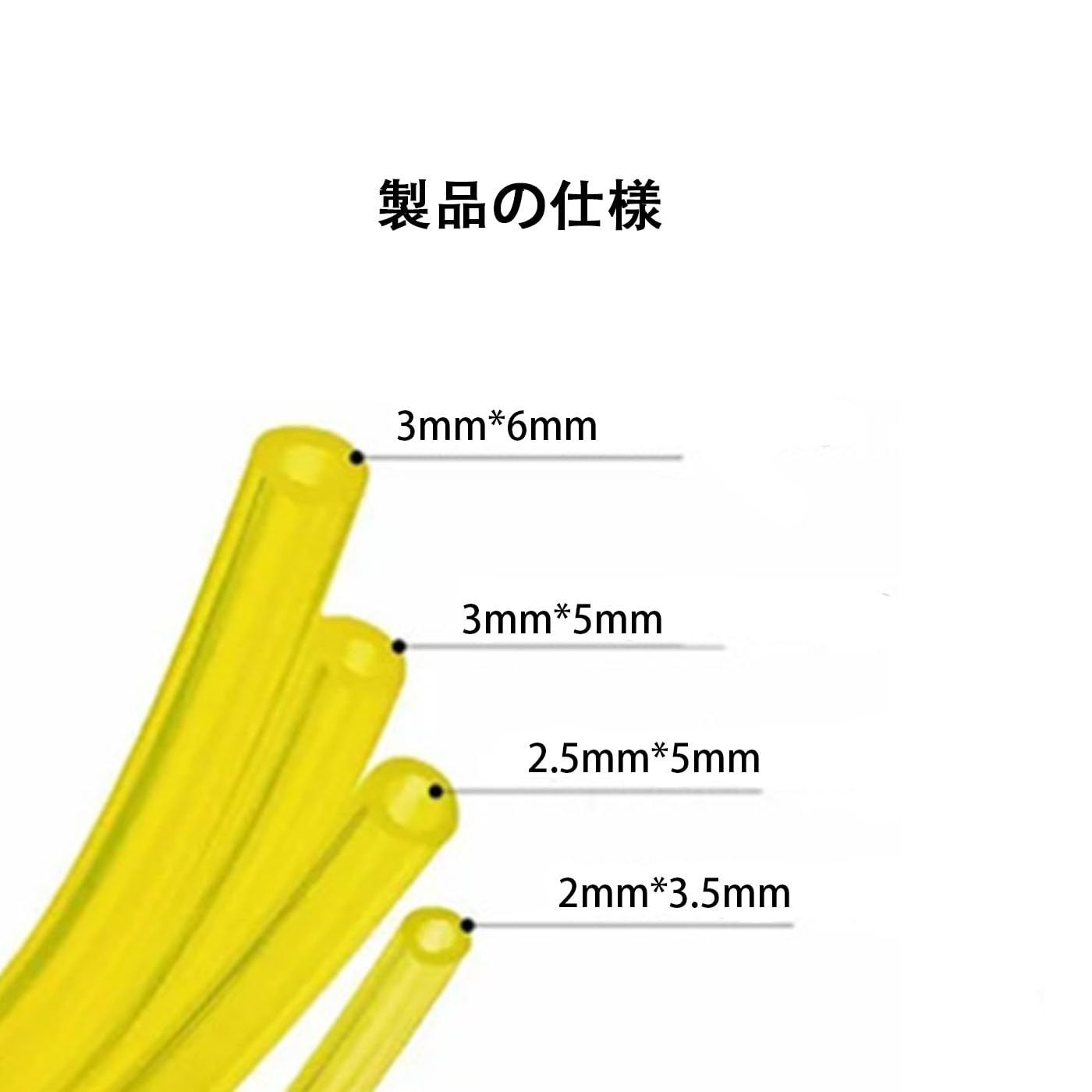 【製品仕様】パッケージには4種類のサイズの燃料ホースが含まれており、内径×外径はそれぞれ 2×3.5mm、2.5×5mm、3×5mm、3×6mm です。各ホースの長さは 1.5m です。