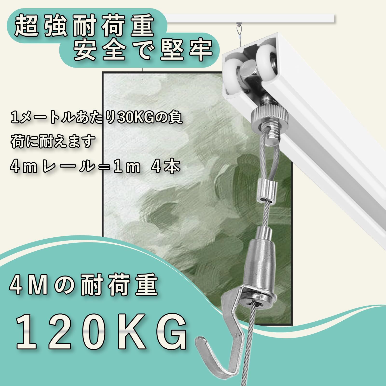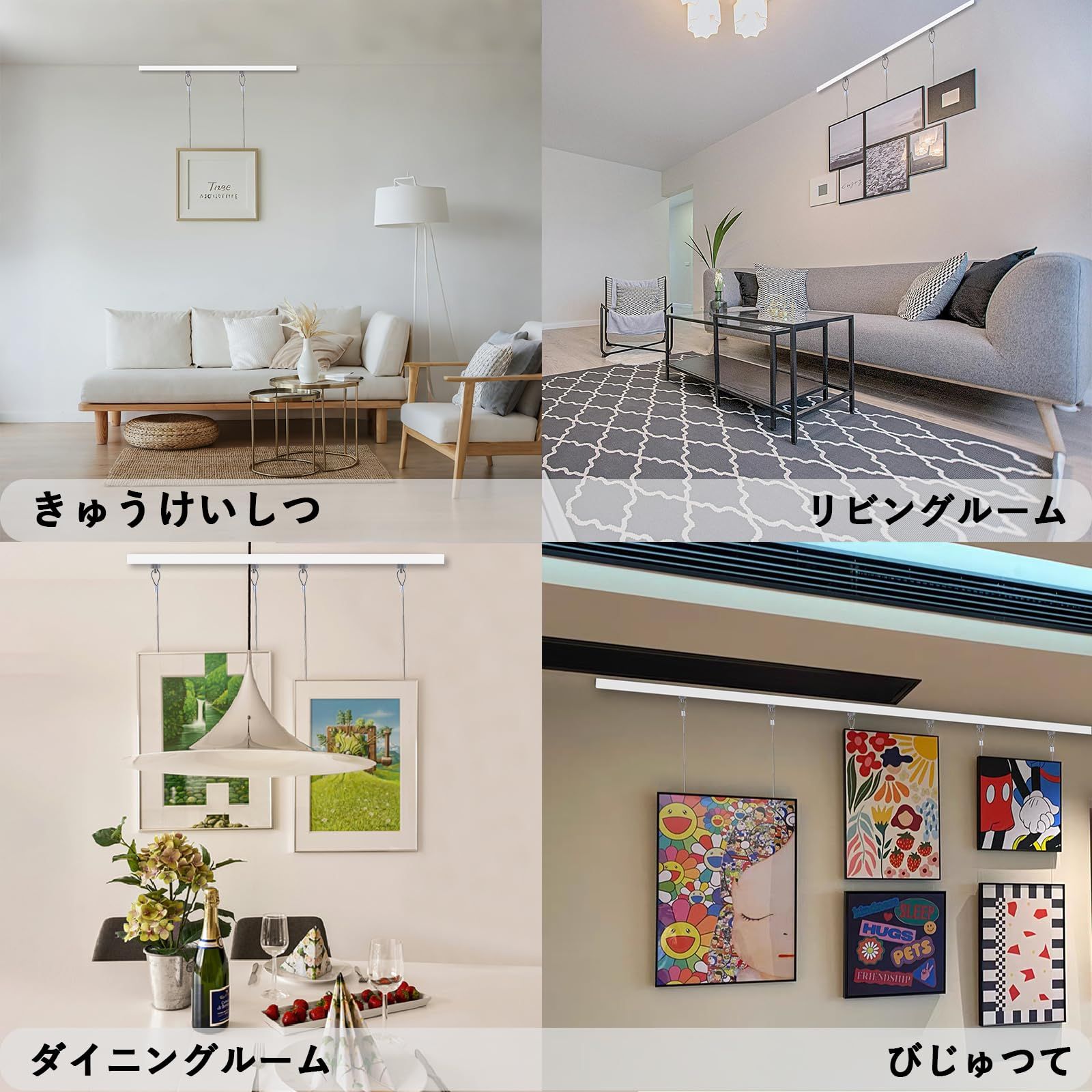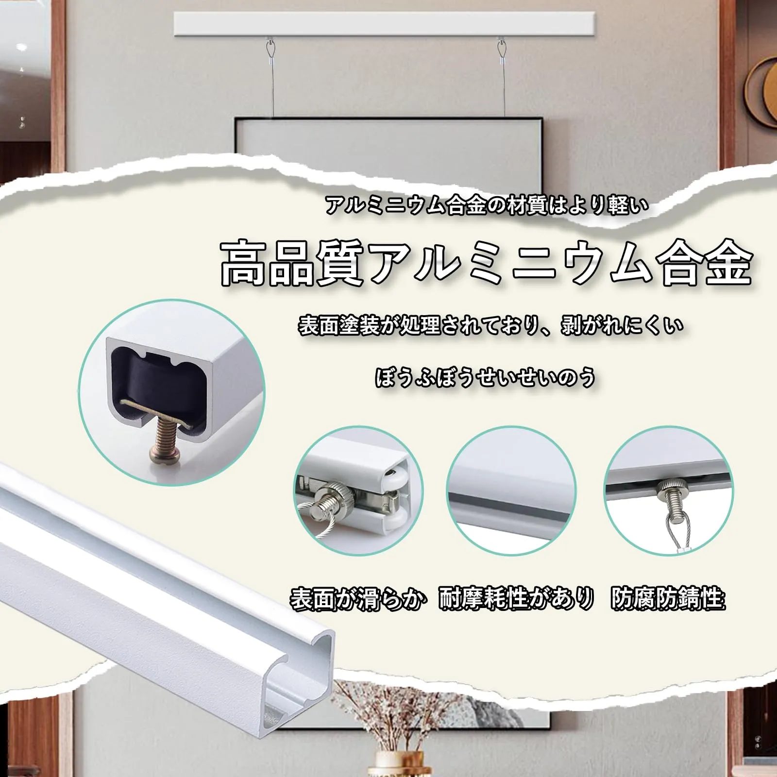 【取り付け簡単】穴を開けてゴムキャップとネジを取り付け、紐を掛けるだけで完了します。ピクチャーレールは高強度のアルミ合金で製造されており、表面は滑らかでバリがなく、優れた防腐および防錆性能を持っています。注:4Mのレール(4M*4本) 耐荷重: 120kg