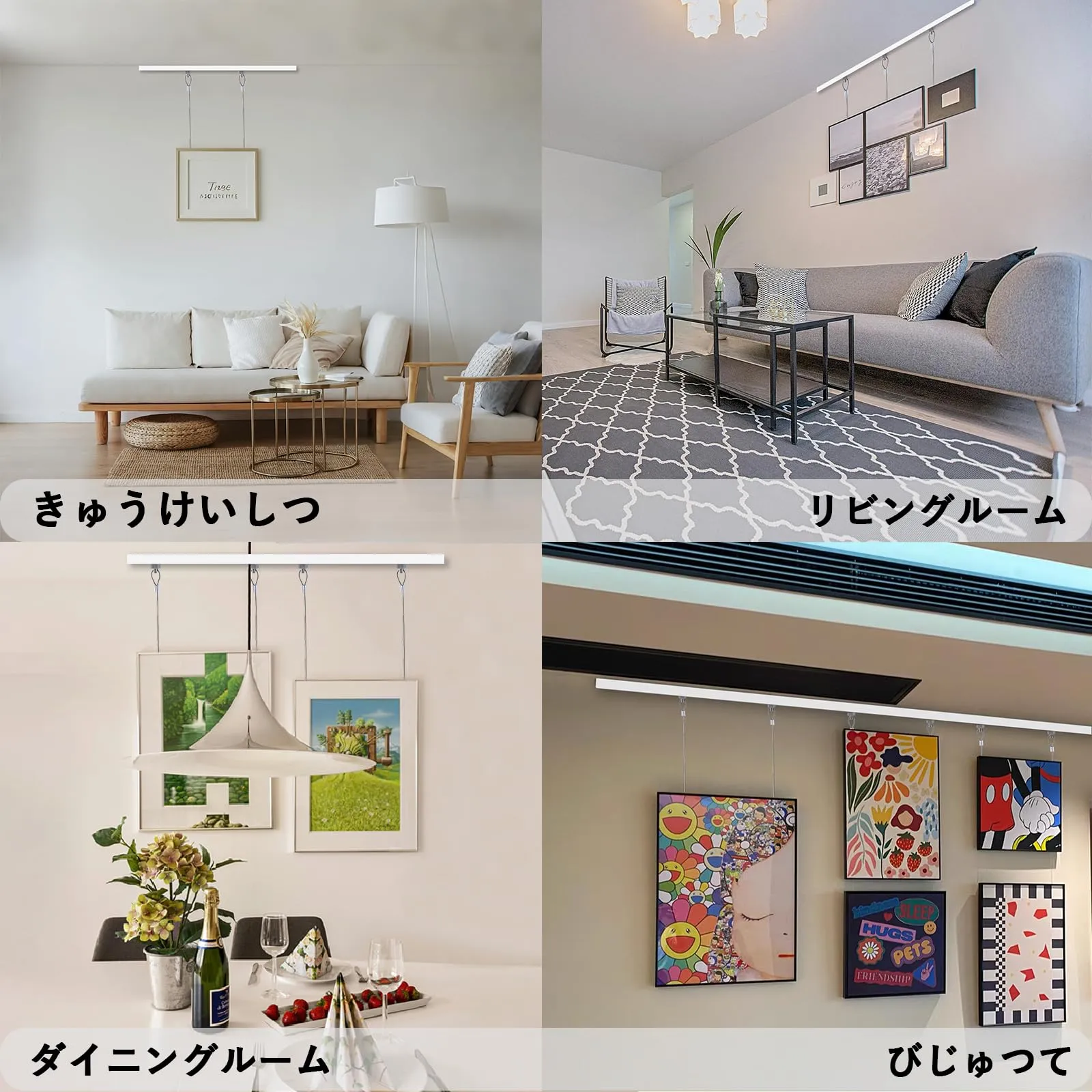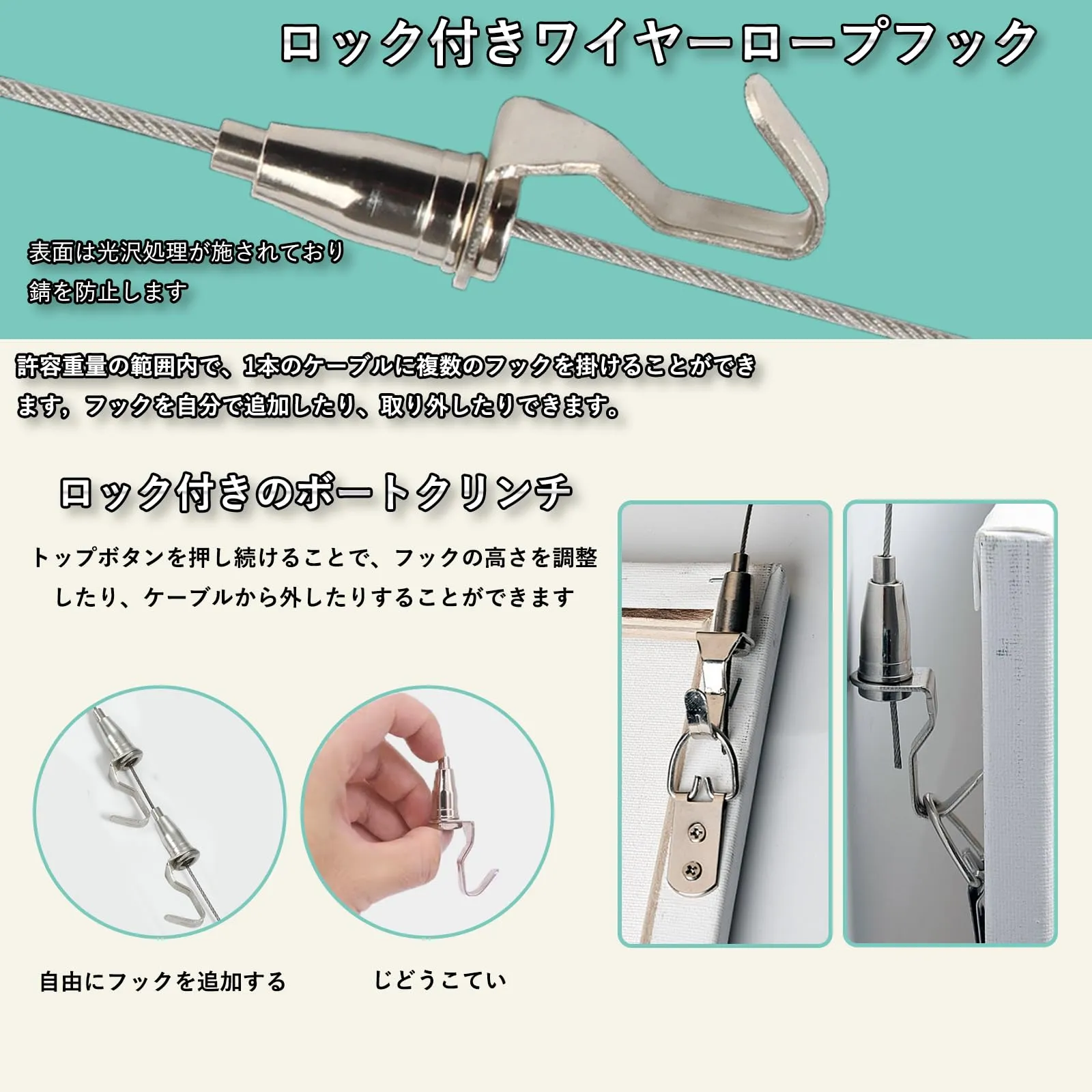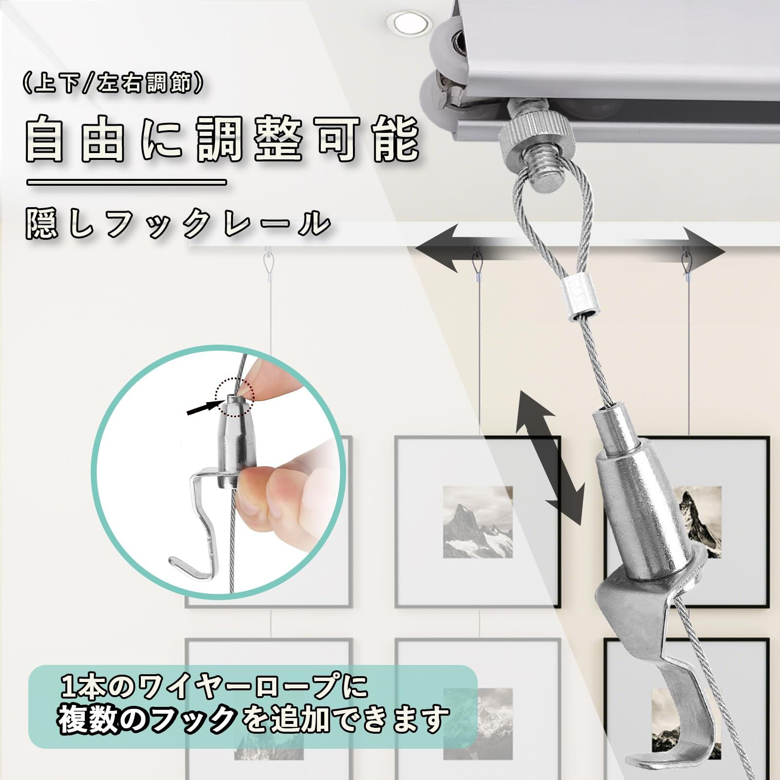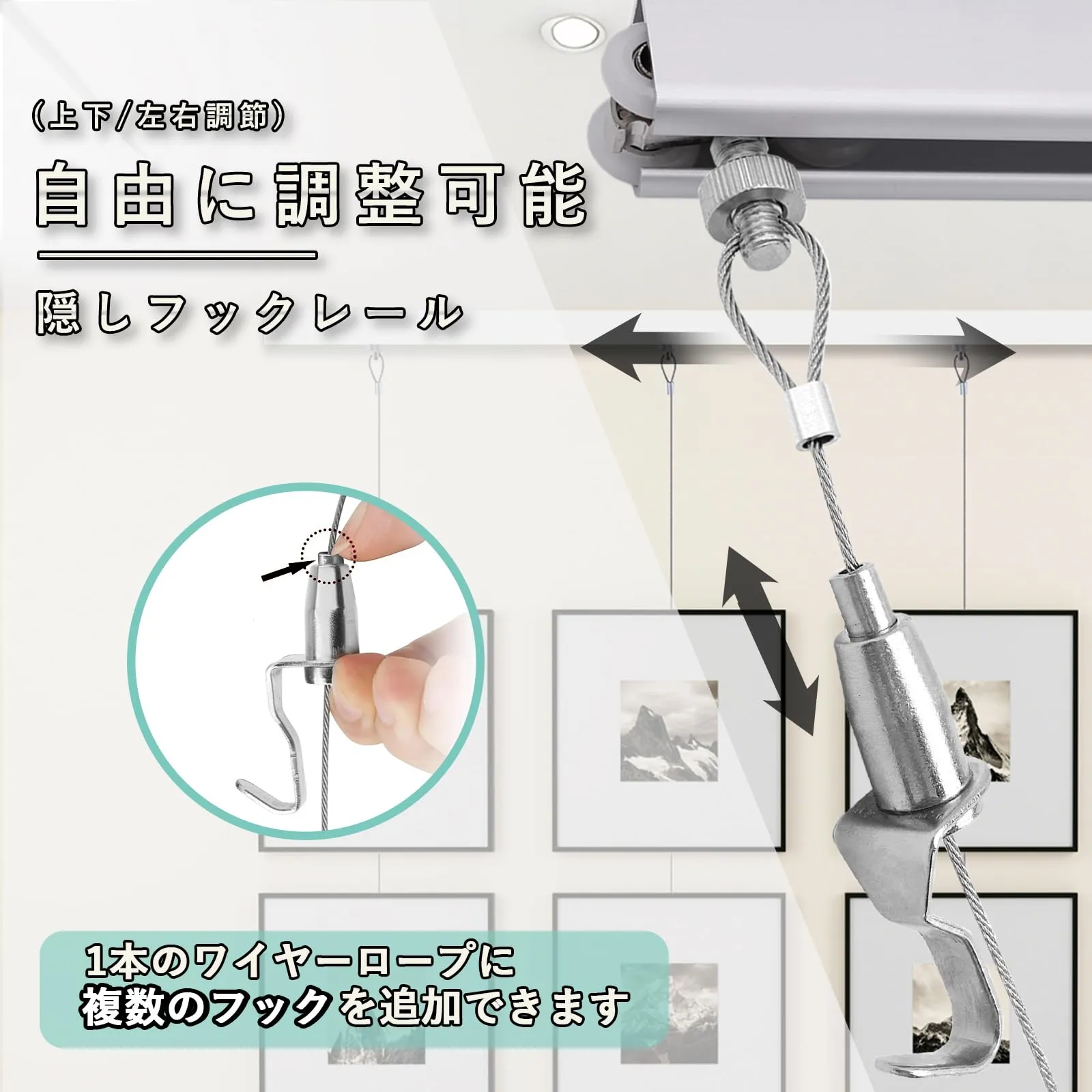 【自由調整】レールは上下左右に自由に位置を調整できます。ワイヤーは左右の位置を調整でき、フックは上下の位置を自由に変更できます。また、必要に応じてフックを追加して、複数の作品を展示することができます