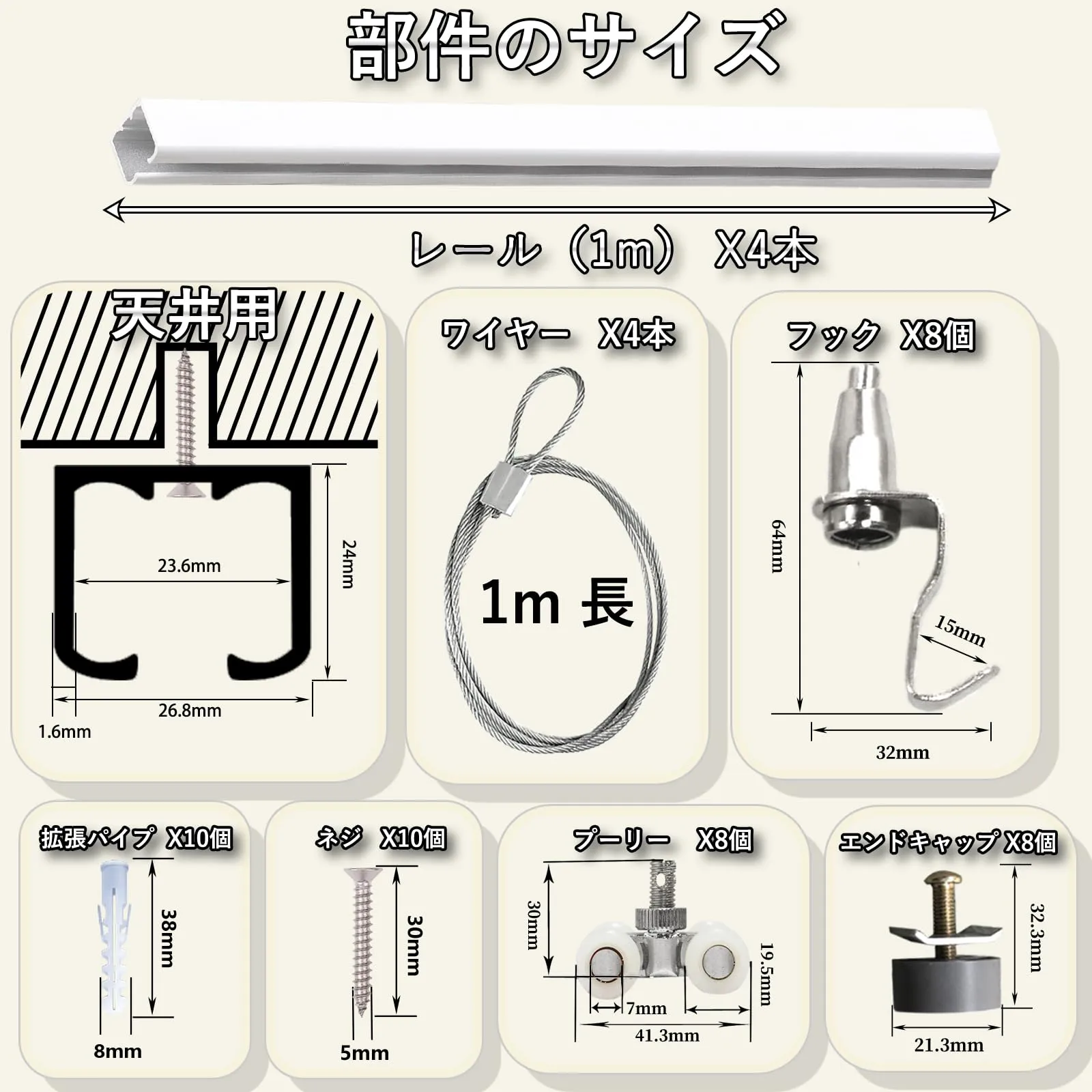 【レール内容】ピクチャーレール100cmx4本、ループ式ワイヤー100cmx8本、カバーx8個、取り付けネジx10個、プラグがx10個