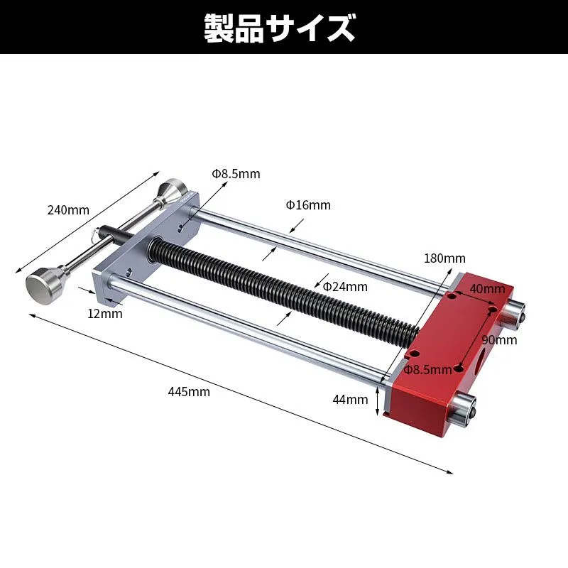 強力な固定力 太さ24mmのメインスクリューと2本のガイドバーで支えるため、締め付け時の「アゴのズレ」やガタつきを防止。木材を正確に、強力に固定します。