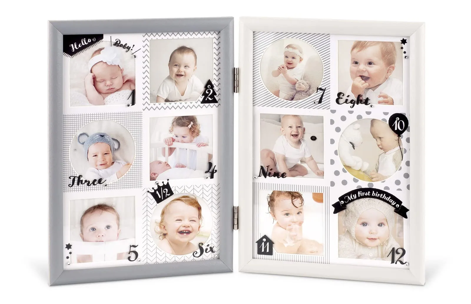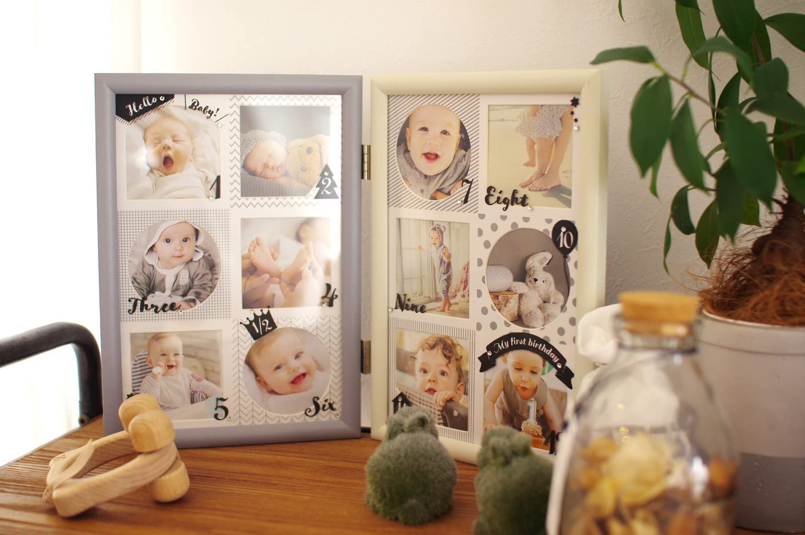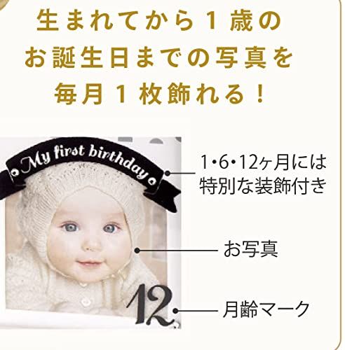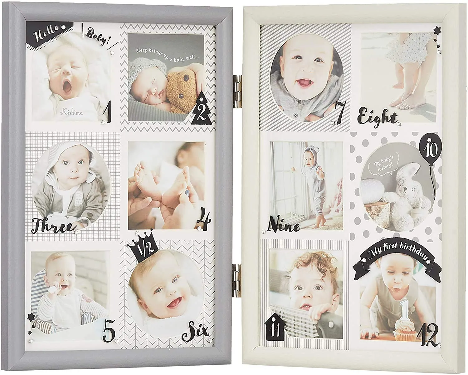 大人カワイイ北欧デザインの ベビー フォトフレーム 卓上 壁掛 モノトーン 本体サイズ38×1.5×高さ26.5cm スクエア12枚 切らずに飾れる12ヶ月フレーム エンヴェールヘルック(R)