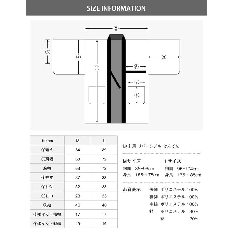 [サイズ]:M:適用身長:165-175cm 胸囲:88-96cm 着丈:84cm 肩幅:68cm 袖丈:37cm 紐:(片方)40cm×2cm
