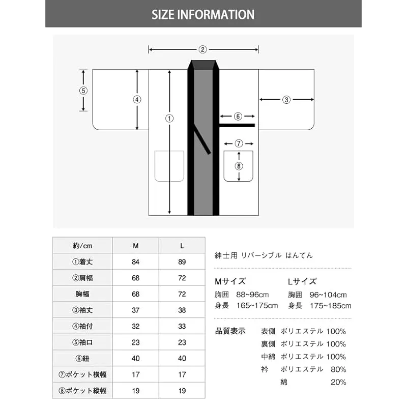 [サイズ]:L:適用身長:175-185cm 胸囲:96-104cm 着丈:89cm 肩幅:72cm 袖丈:38cm 紐:(片方)40cm×2cm